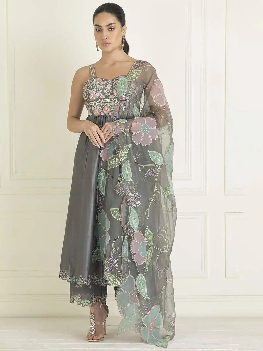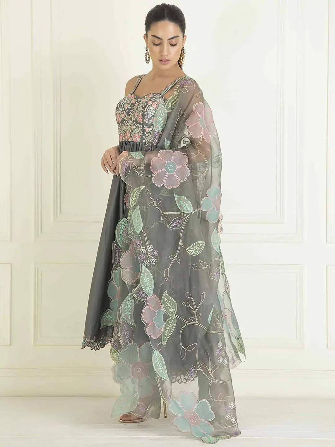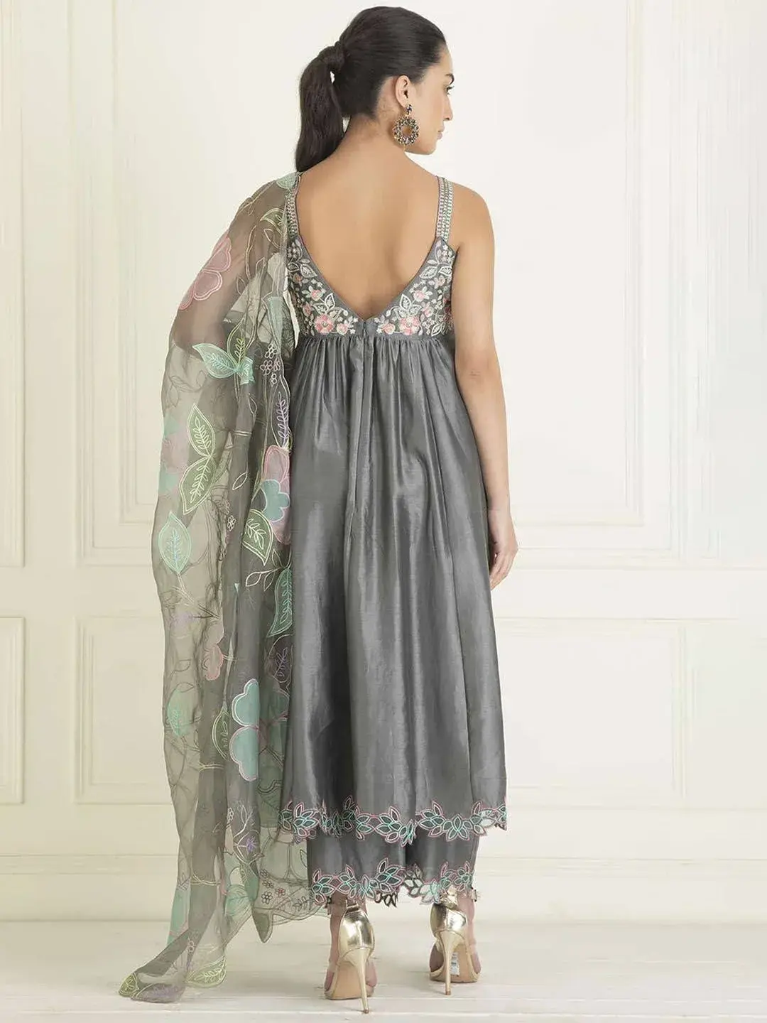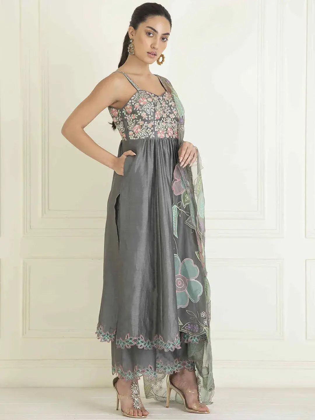 Grey embroidered Kurta with Palazzo with Dupatta Kurta design: Floral embroidered Anarkali shape Regular style Shoulder straps, sleeveless no sleeves Thread work detail Calf length length with flared hem Pure cotton knitted and woven fabric Palazzo design: Solid Palazzo Drawstring closure Pure cotton knitted and woven fabric Dupatta design: Embroidered Dupatta Scalloped borders