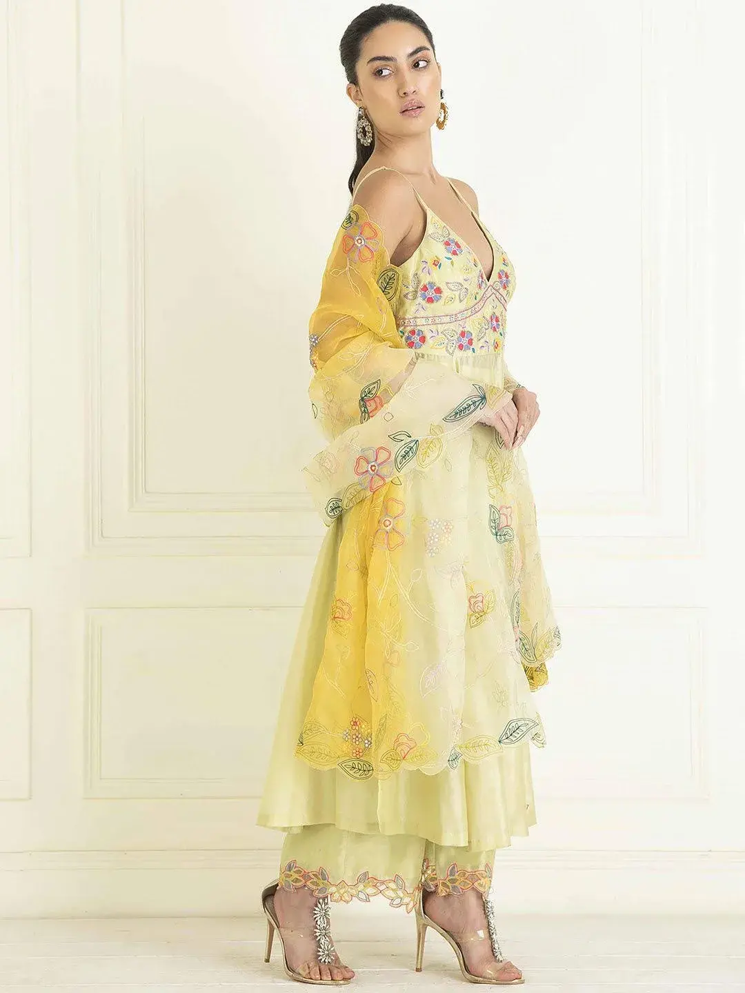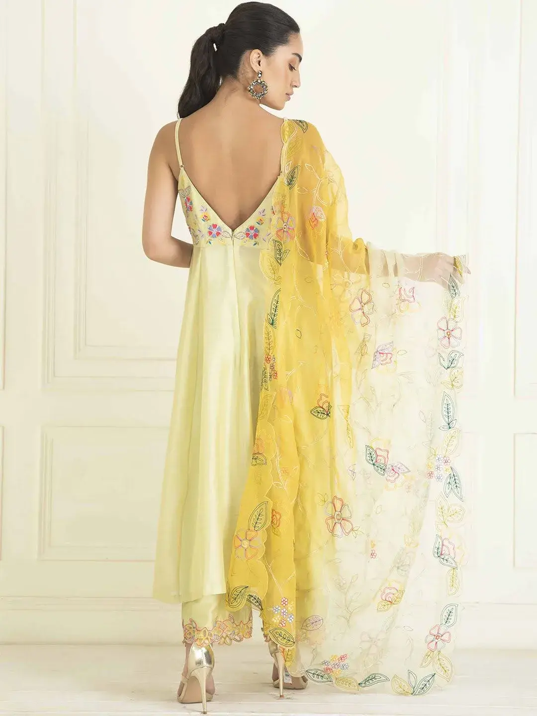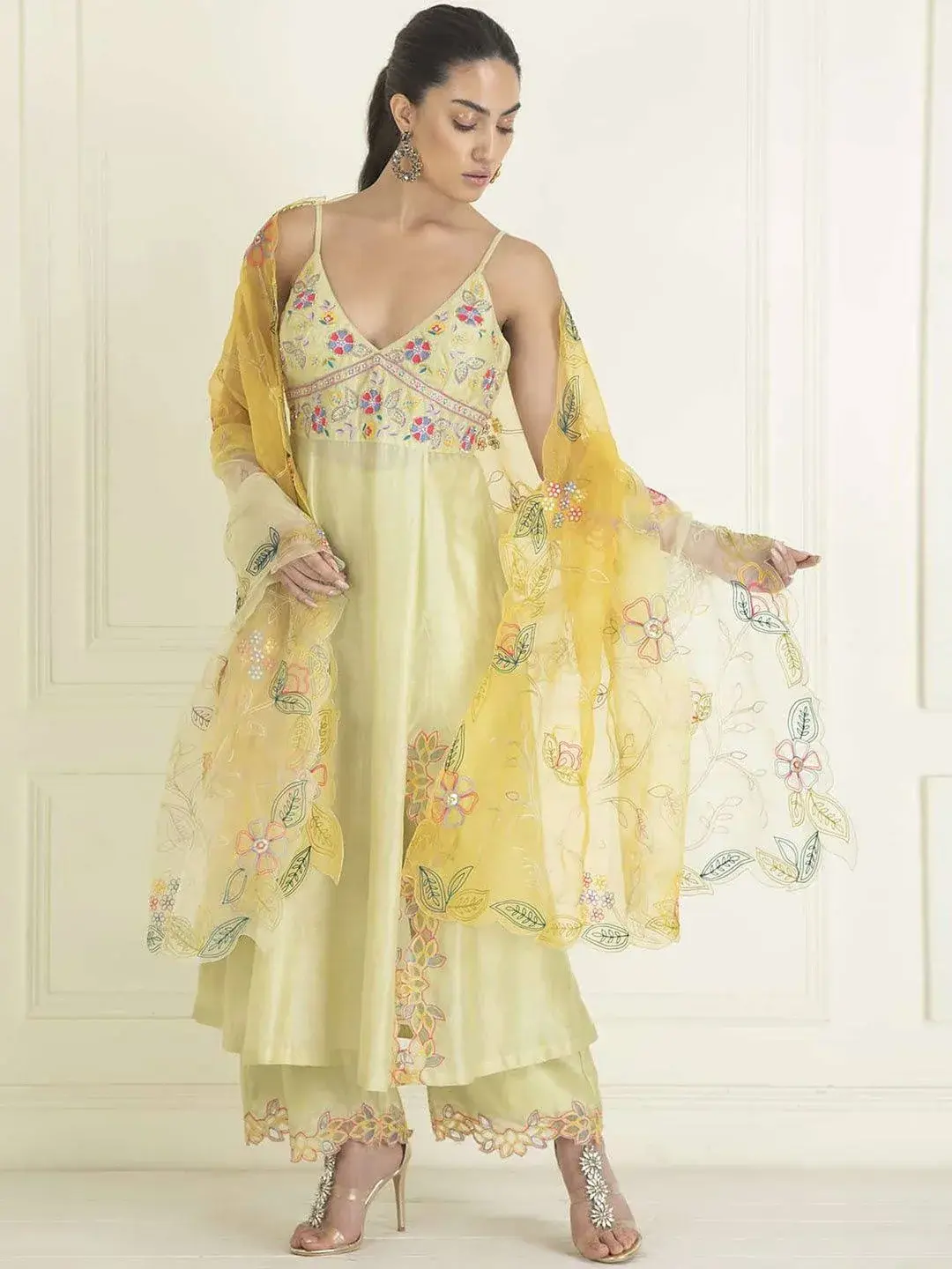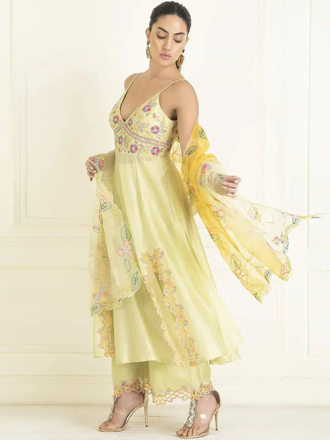 Yellow embroidered Kurta with Palazzo with Dupatta Kurta design: Floral embroidered Anarkali shape Regular style Shoulder straps, sleeveless Calf length length with flared hem Pure cotton knitted and woven fabric Palazzo design: Solid Palazzo Drawstring closure Dupatta design: Embroidered Dupatta Scalloped borders