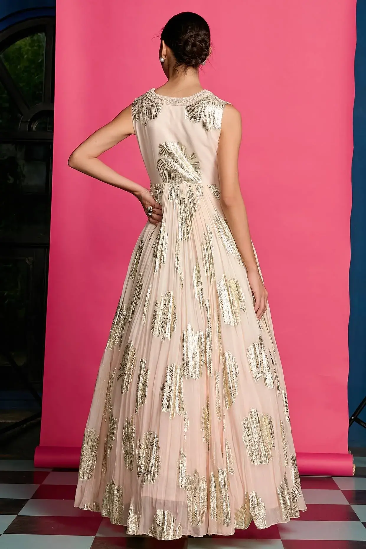 Featuring A Peach Anarkali In Shimmer Base. It Is Paired With An Embroidered Jacket. Accentuate With Statement Jewellery And Heels For Any Festive Occasion Or Sangeet Ceremony. Components: 2 (Anarkali, Jacket) Fit: Fitted At Bust. Composition: Shimmer. Care: Dry Clean Only.