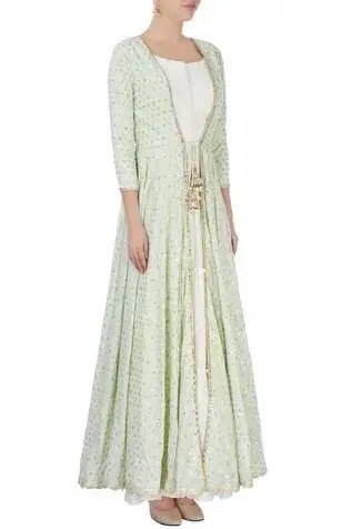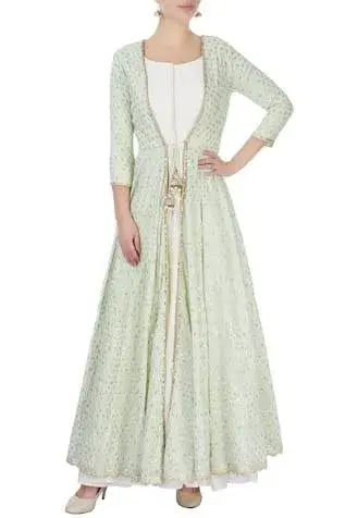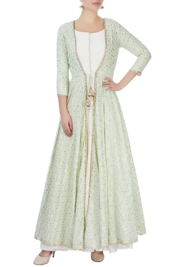 Mint green long jacket with embellished motifs. Comes with white tiered flared tunic. Components:2 Neckline: Wide Sleeve Length: Tunic: Sleeveless; Jacket: Three fourth Gather detail on dress Tiered maxi with ruffle detail Scalloped hemline on jacket Closure: Front tie-up tassel on jacket - Kanika's