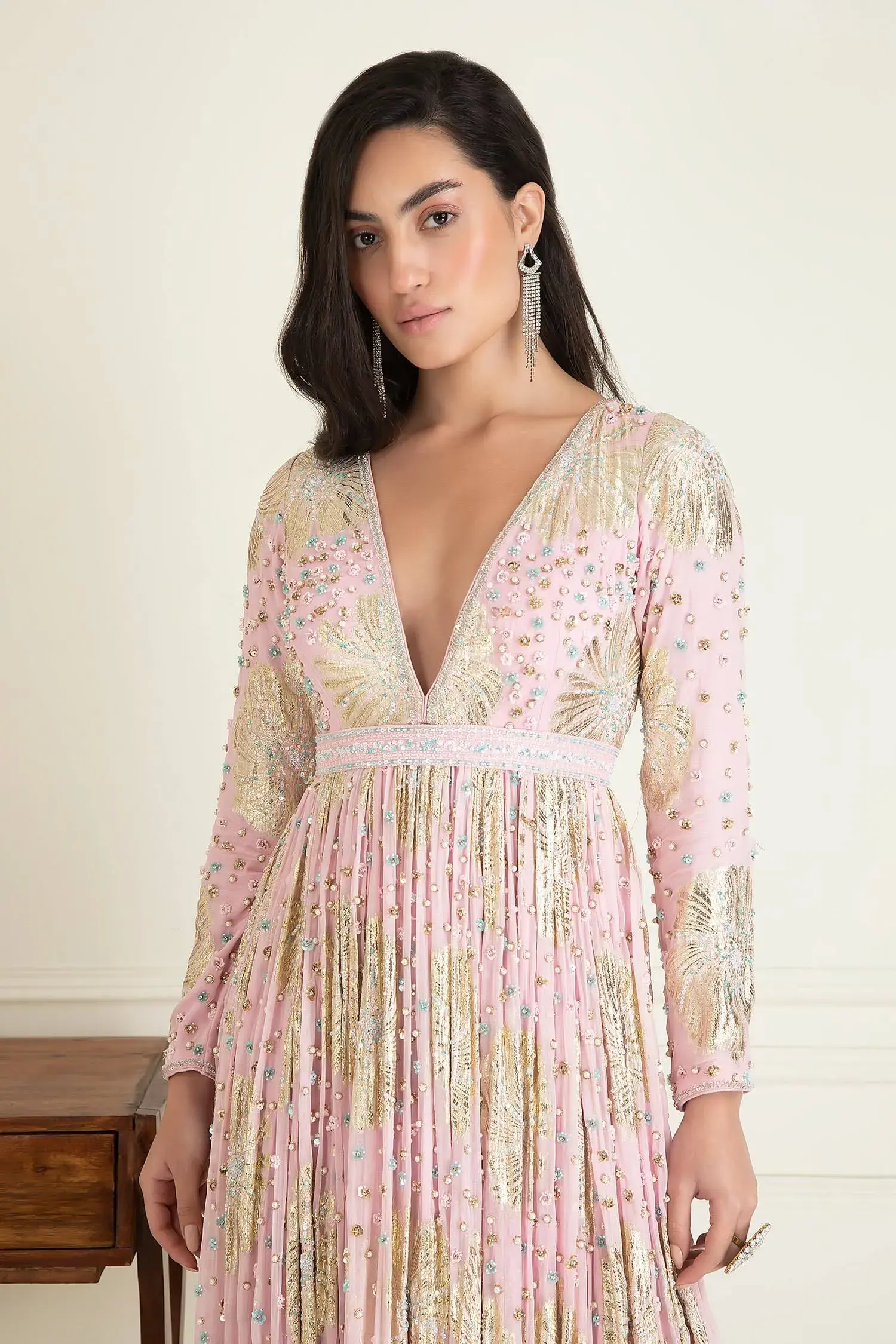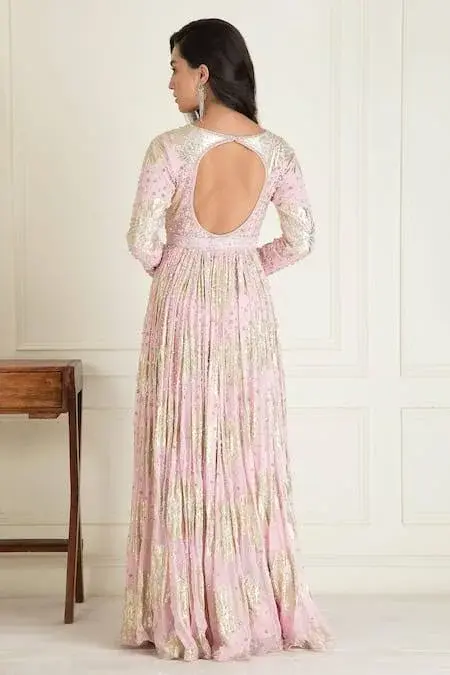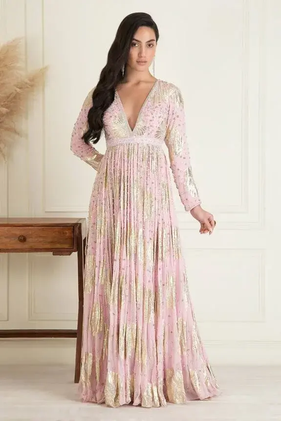 Blush pink anarkali with sequin, bead embroidery in geometric pattern.