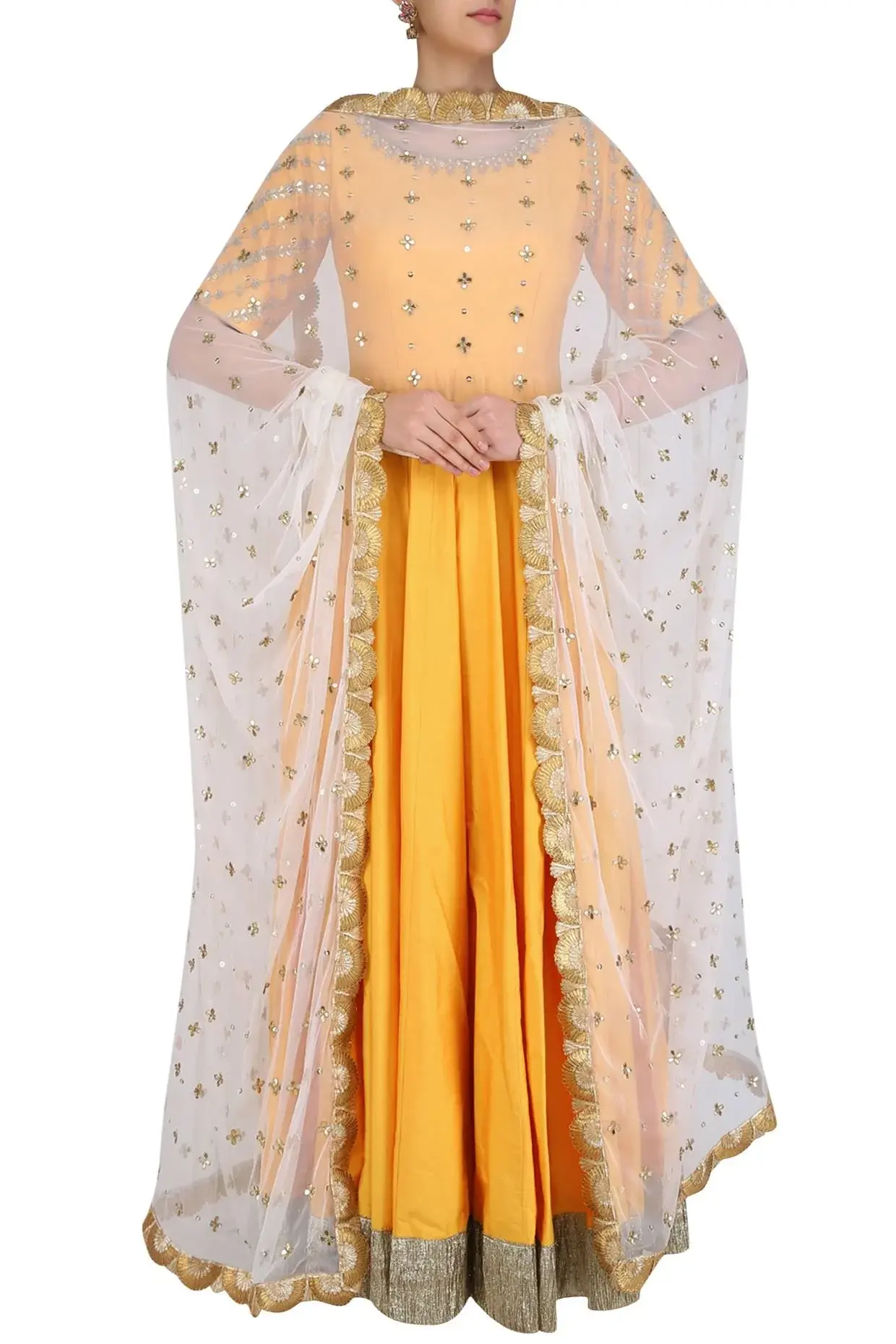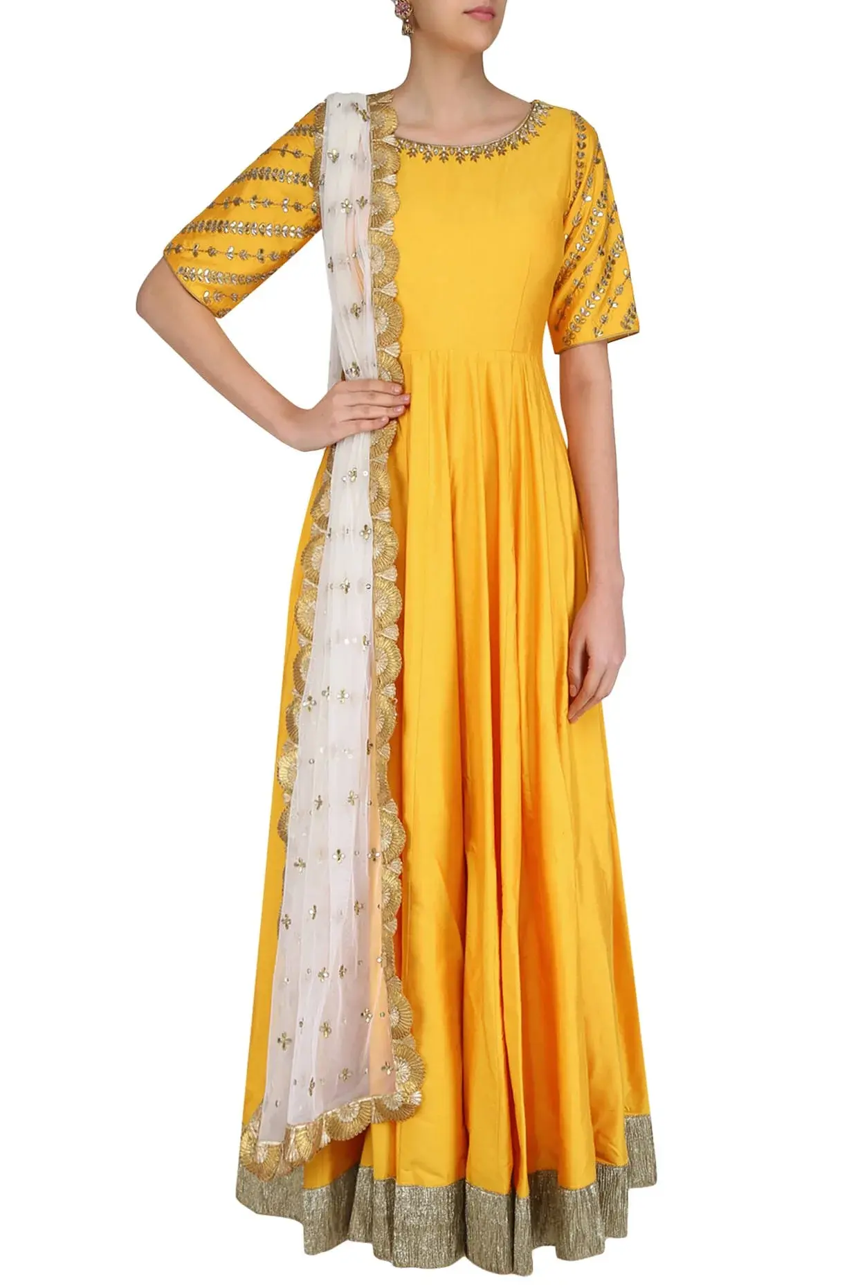 This Set Features A Yellow Flared Kalidaar Anarkali Kurta In Cotton Silk Base With Gold Floral Gota Patti Embroidery On The Sleeves And Neckline. It Has Gold Wide Lace Border Around The Hem. It Is Paired With An Off White Net Dupatta With Floral Bootis Scattered All Over Along With Scaolloped Border At The Edges. Fit: Cut For Relaxed Fit....