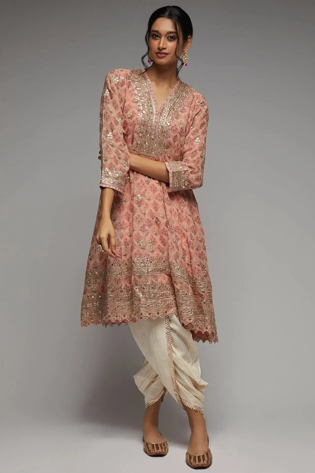 Featuring A Blush Pink Tunic In Georgette Base With Embroidery. It Is Paired With Contrasting Ivory Cotton Dhoti Pants. Fit: Fitted At Bust And Waist. Composition: Georgette, Cotton. Care: Dry Clean Only.