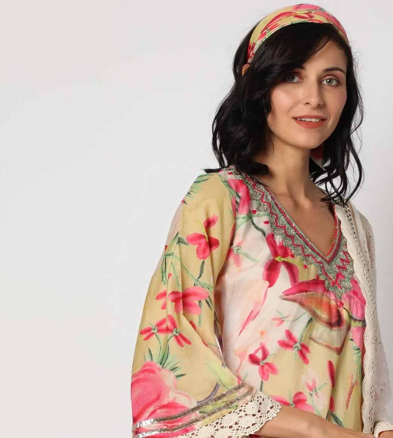 Intrigue one and all with this flared tunic set from the Khushi collection, that will add a dash of extra charm to your look. Using bold vibrant ochre base print, the flared A-line tunic is embroidered with gota and threadwork. The cutwork palazzo and badla dupatta has gota highlights and lace trims. The tunic is made using cotton silk, palazzo...