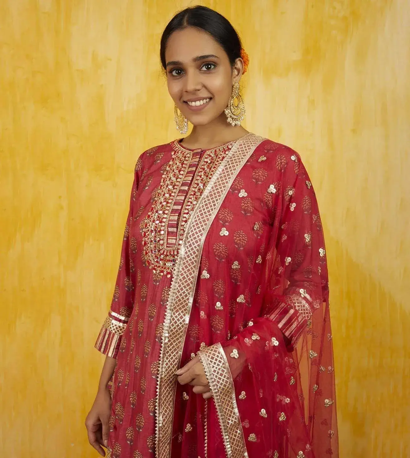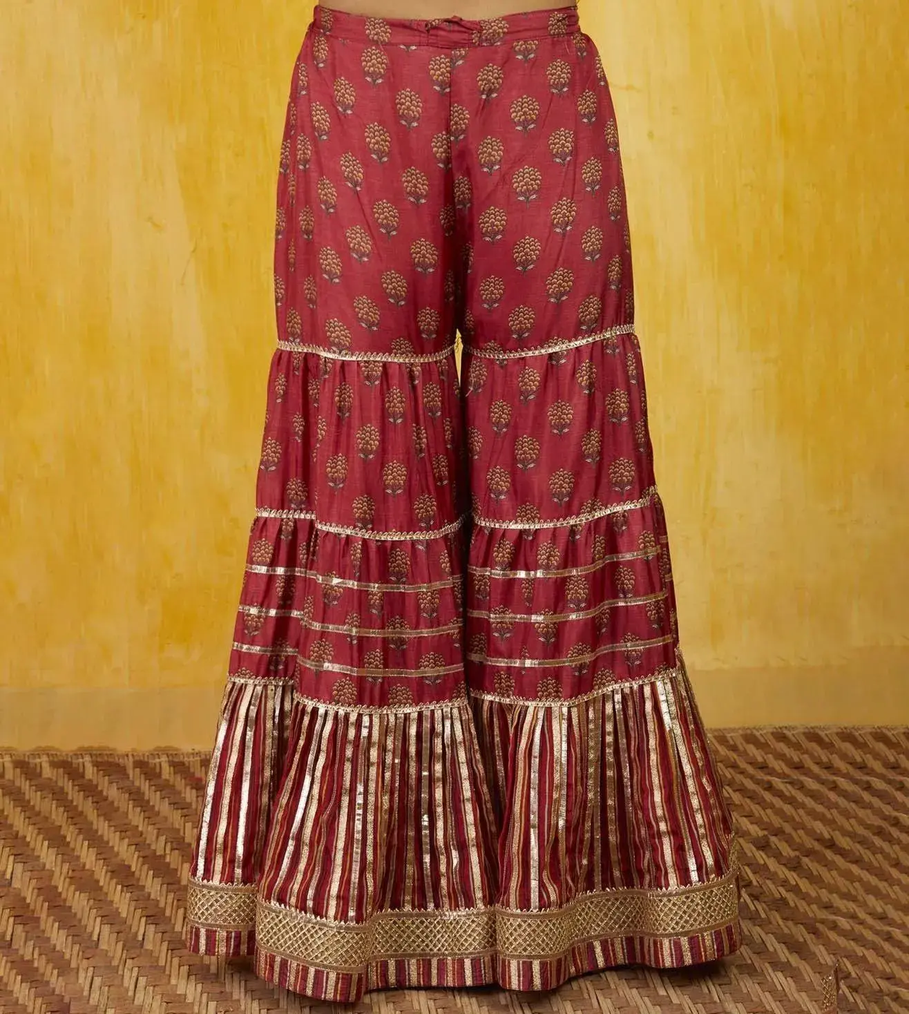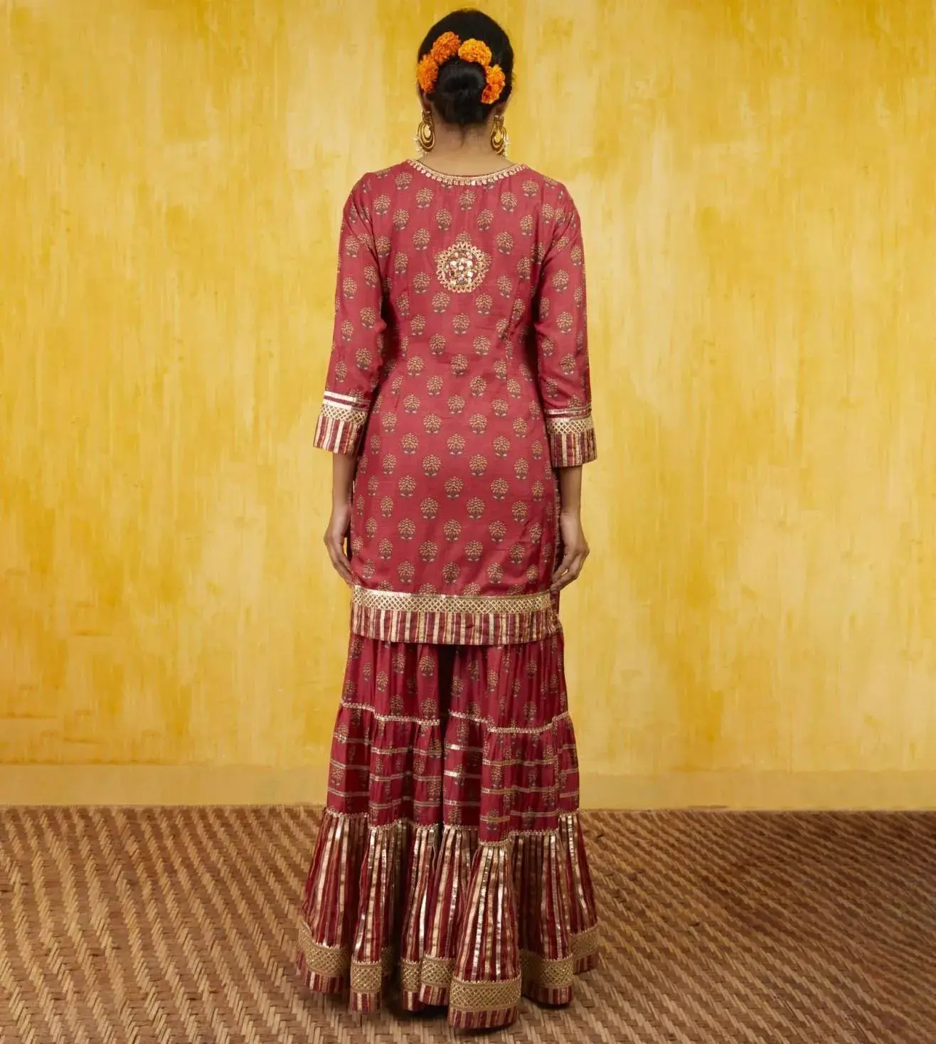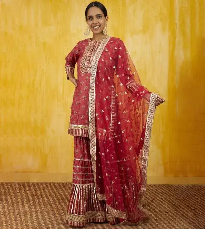 This Marigold Booti sharara set includes a floral printed tussar kurta which is embellished with signature gota and threadwork, highlighting the neckline. It has been paired up with a matching tussar sharara with extensive gotta work and net dupatta to complete the ensemble. Disclaimer: Product colour may slightly vary due to photographic lighting sources. Country Of Origin - India.