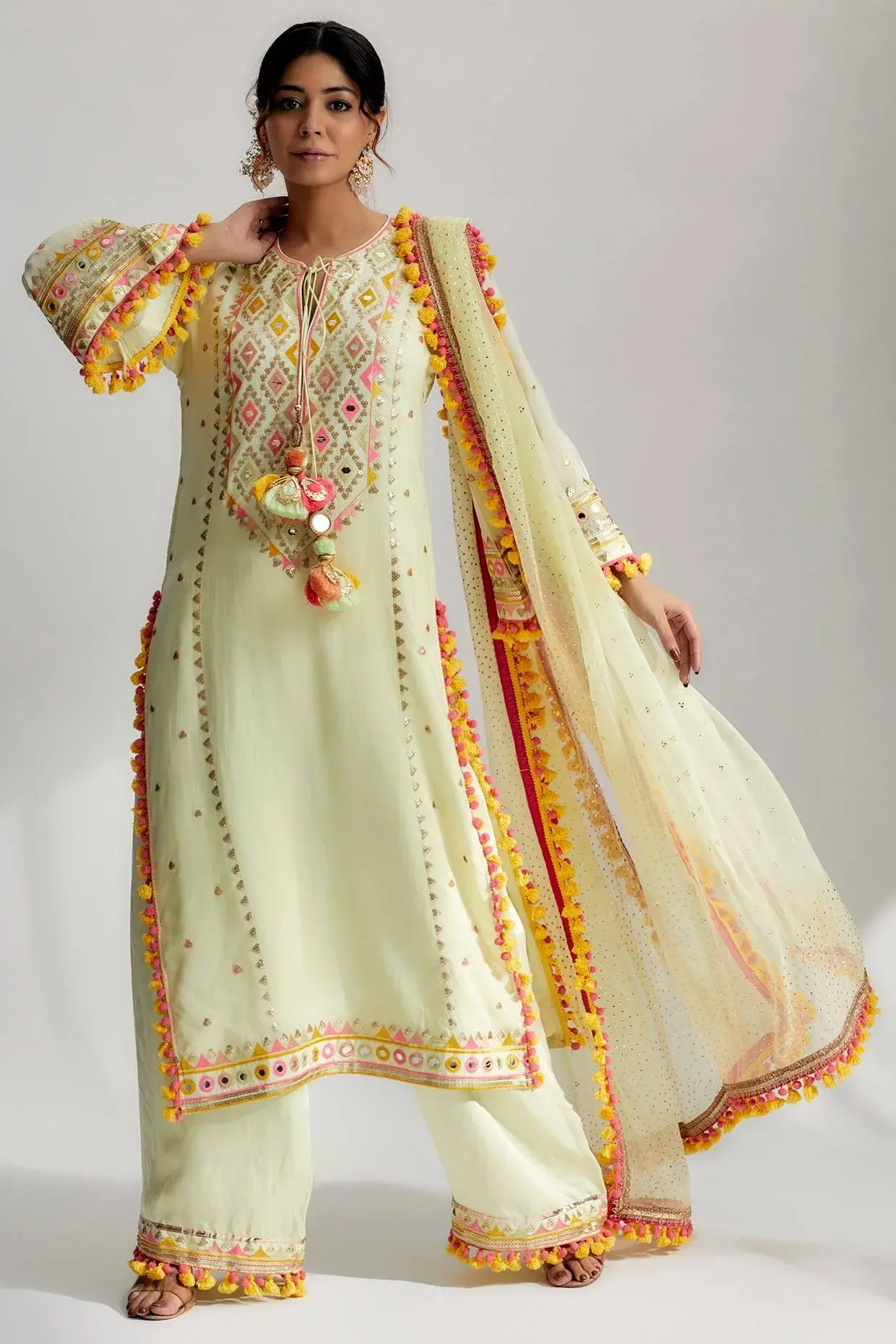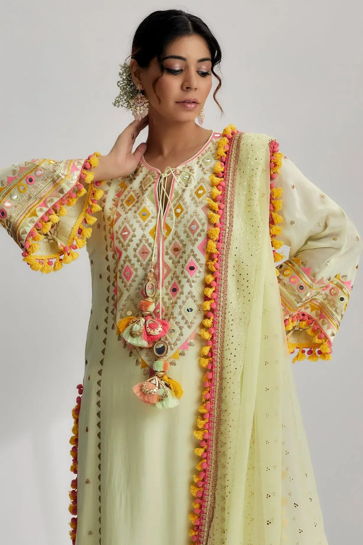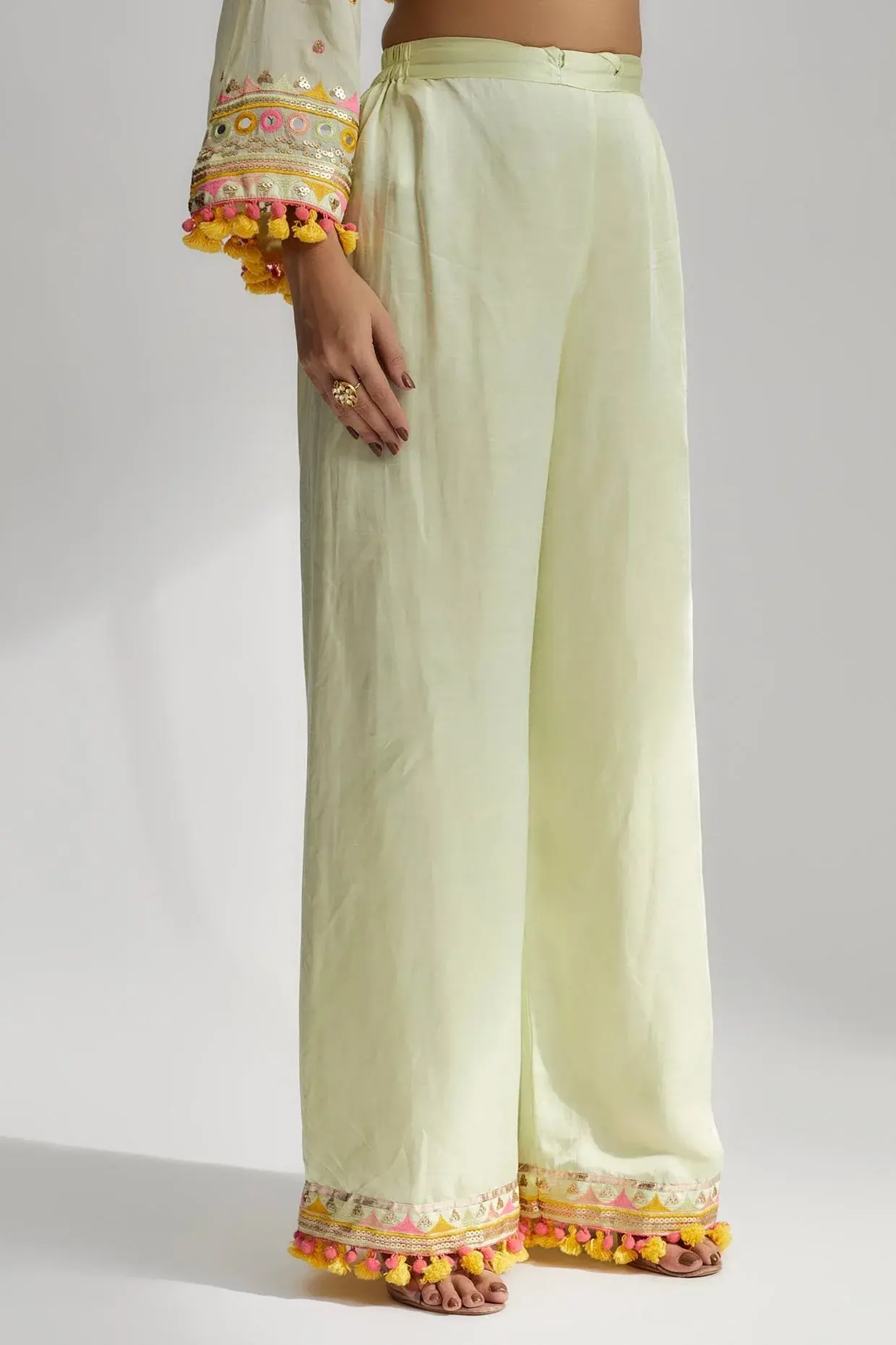 Featuring A Mint Long Kurta In Viscose Base With Mirror Hand And Machine Embroidery, Including Tassels. It Is Paired With Linen Satin Palazzo Pants And A Chiffon Dupatta. This Ensemble Is Perfect For Celebratory Occasions, Cultural Events, Or Any Festive Gathering Where You Want To Make A Lasting Impression. Components: 3 Fit: Fitted At Bust And Waist. Composition: Viscose, Linen...
