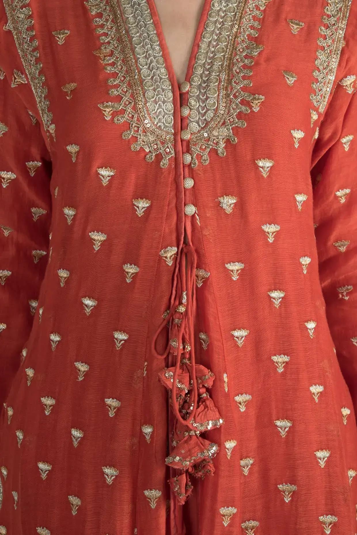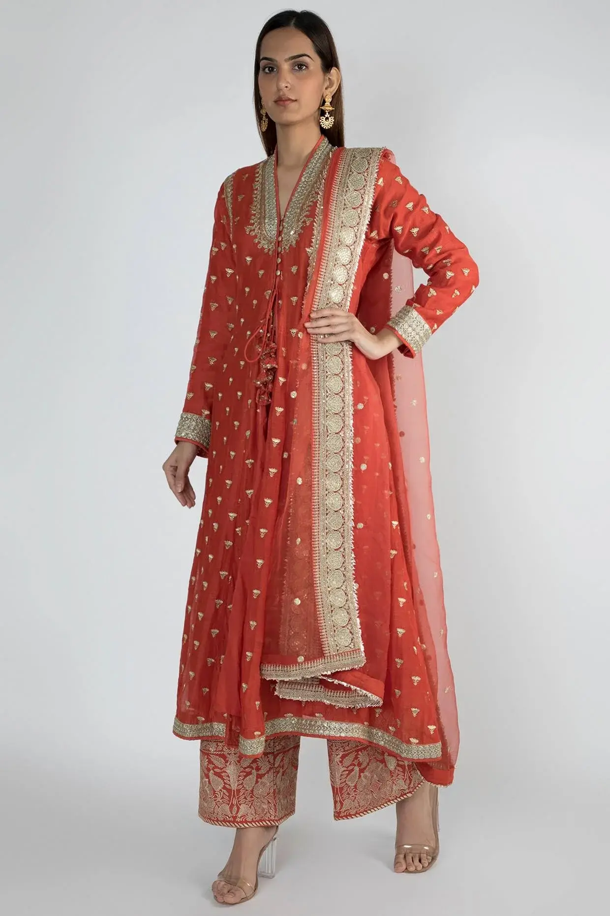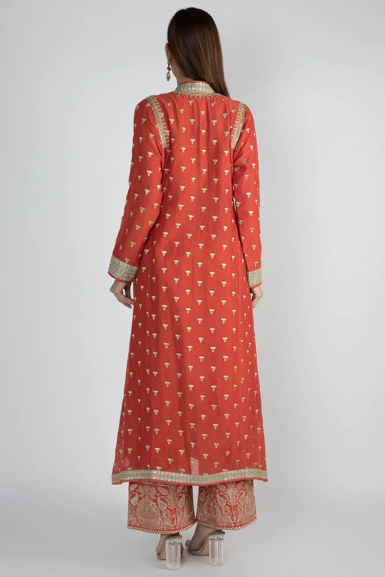 Featuring A Red Jacket Style Tunic In Chanderi Base With Thread, Sequins And Zardosi Work. It Is Paired With Matching Palazzo Pants And Dupatta In Cotton And Organza Base Having Floral Work. Fit: Fitted At Bust And Waist. Composition: Chanderi, Cotton, Organza. Care: Dry Clean Only.