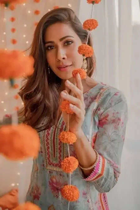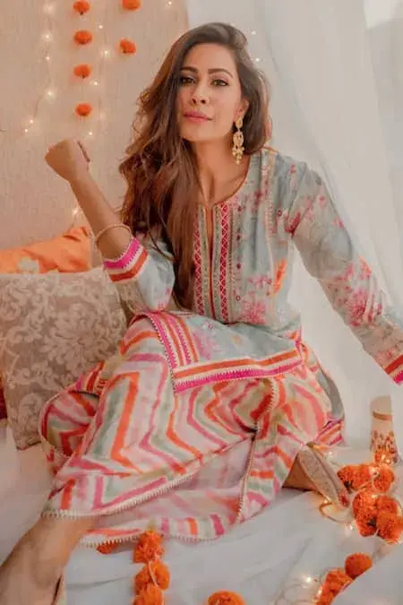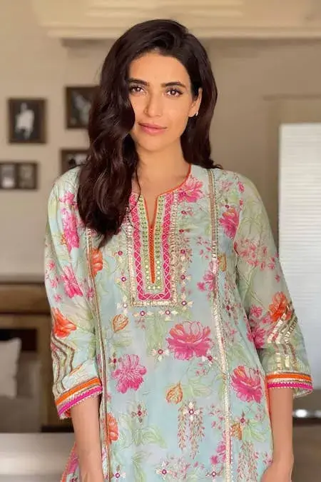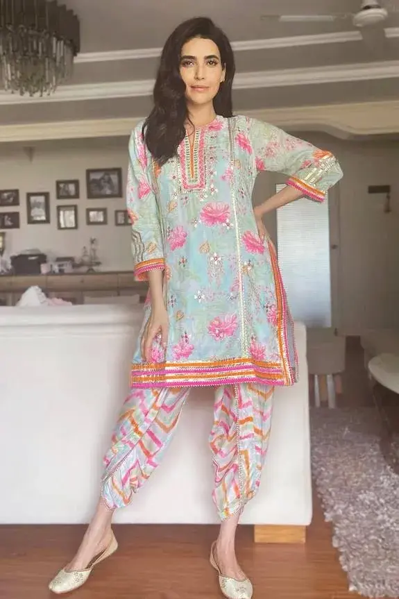 Blue straight kurta with multi-color floral printed motifs and gota cutworked trims. Comes with chevron dhoti pants.