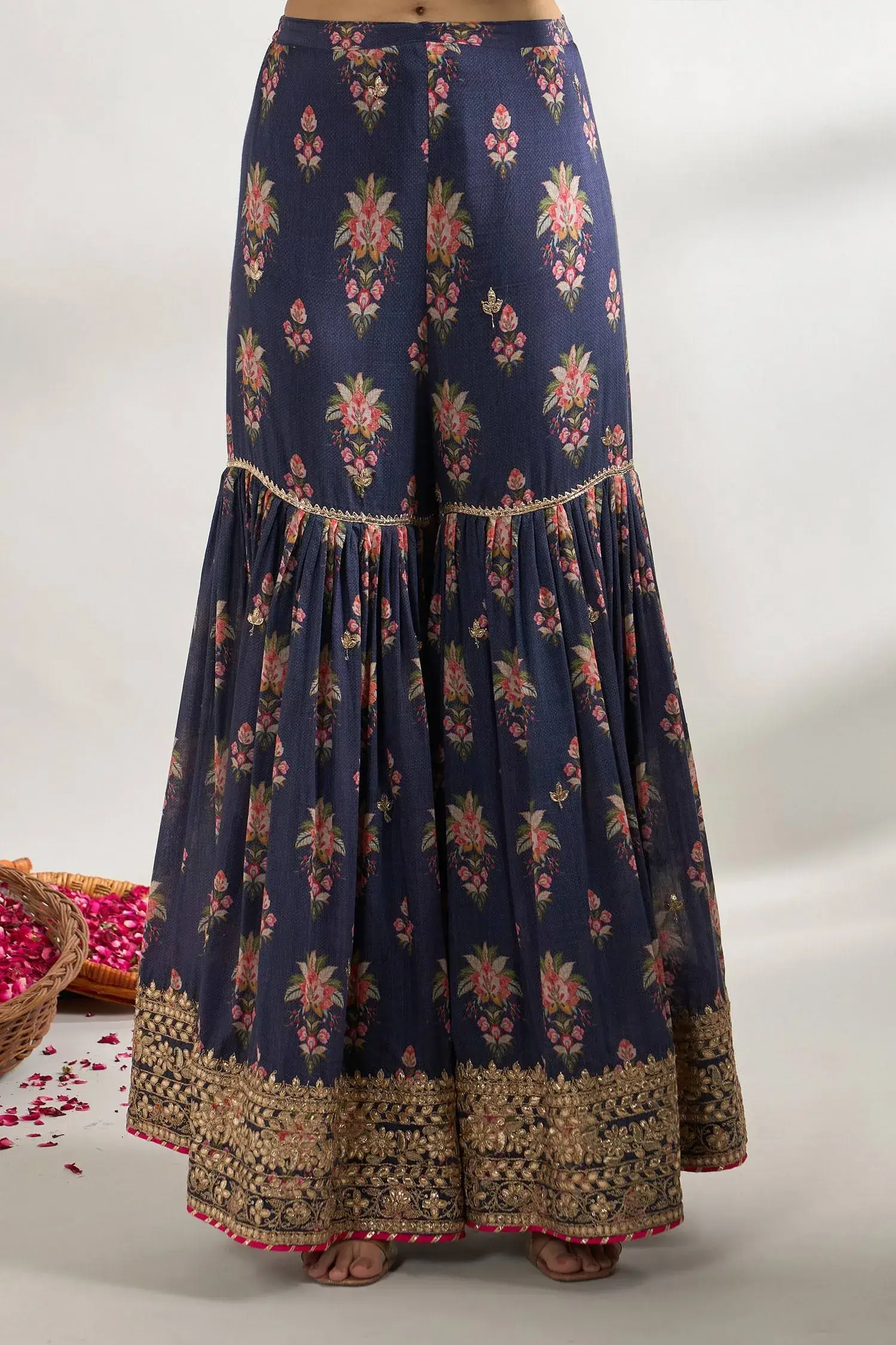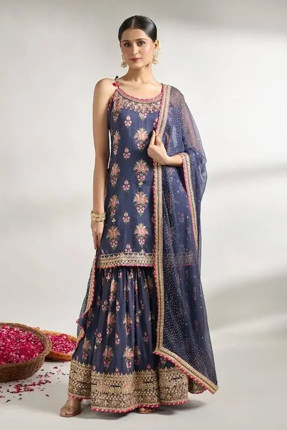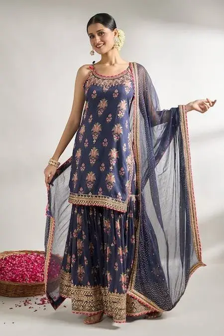 Blue strappy kurta with floral print and gota, sequin, cutdana, mirror embroidered border.