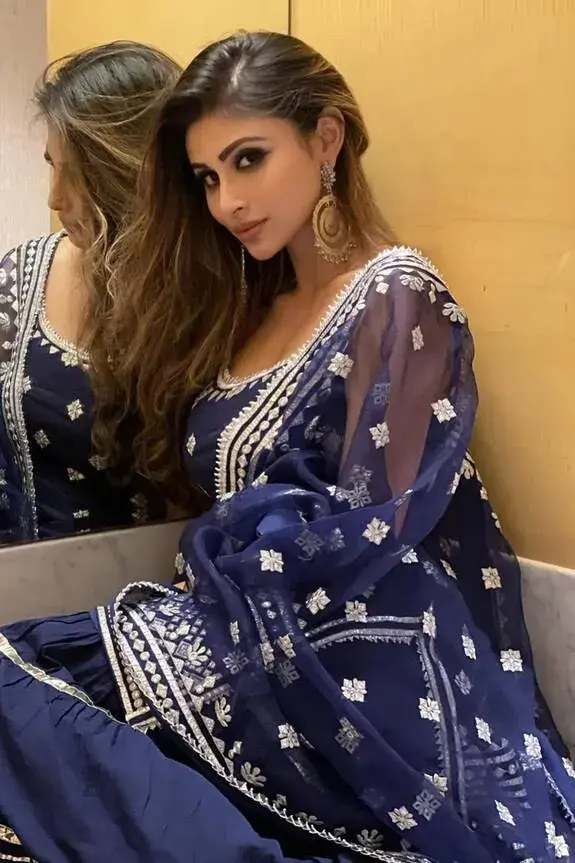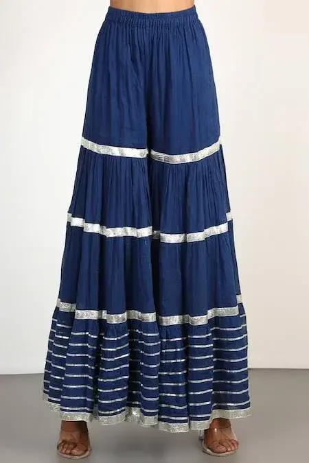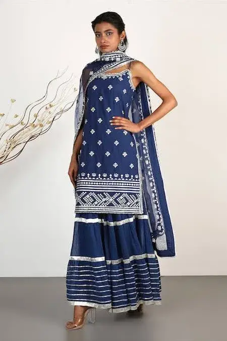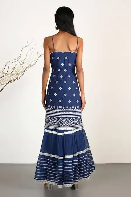 Navy strappy kurta with all-over embroidery and gota trim details. Paired with sharara and dupatta. Component: 3 Embroidered Neckline: Round Sleeve Length: Sleeveless Fabric: Kurta: Cotton Silk; Sharara: Cotton; Dupatta: Organza Color: Blue Embroidery on the sharara Frill detail at the hem Elasticated waist Gota trim at the dupatta Zip closure the back - Kanika's