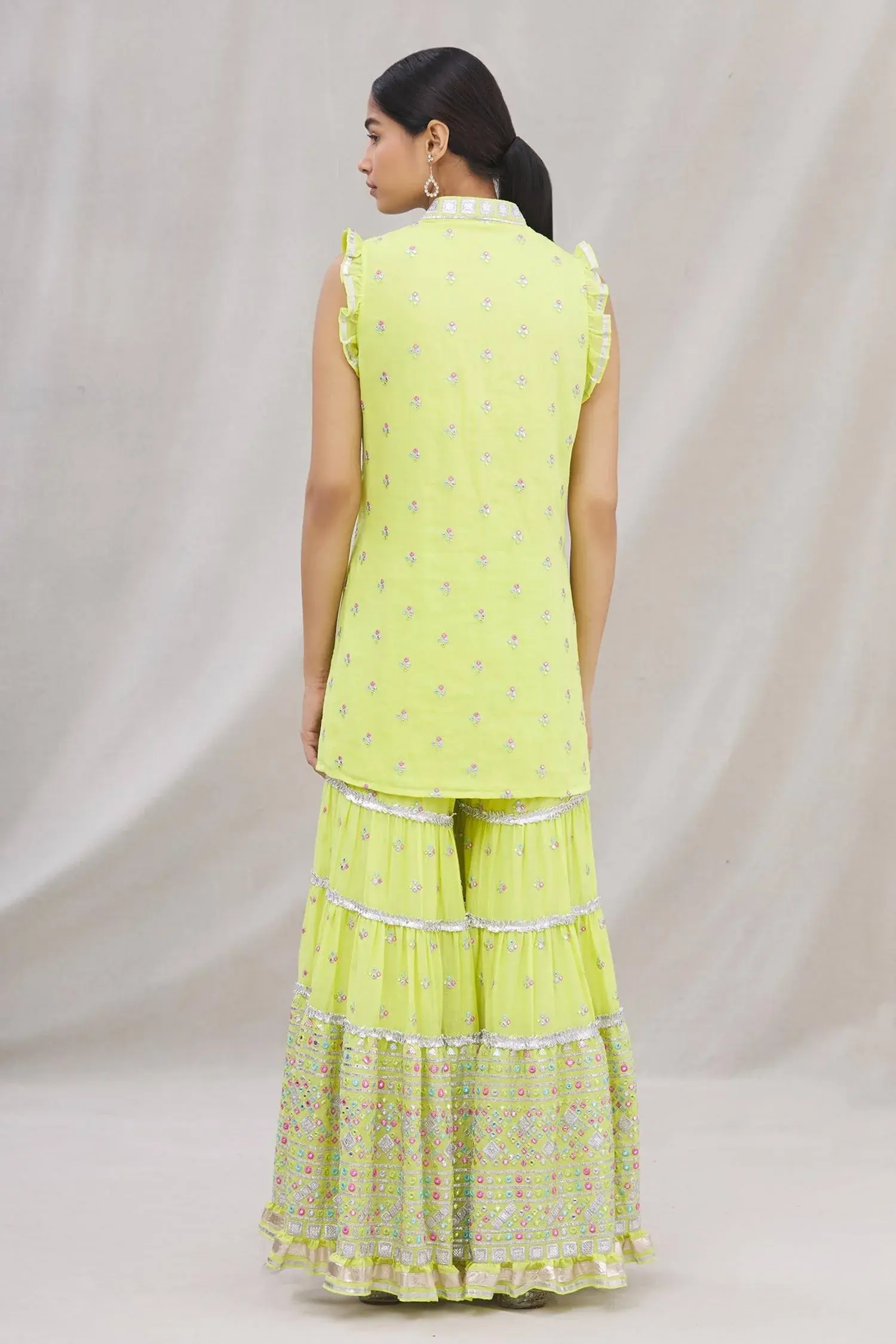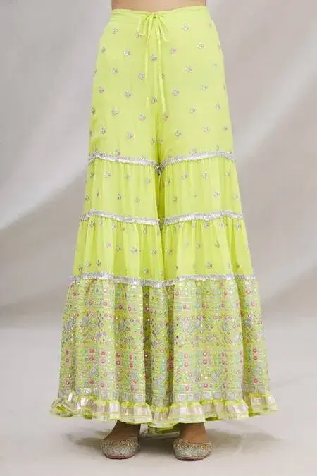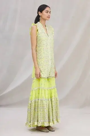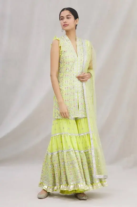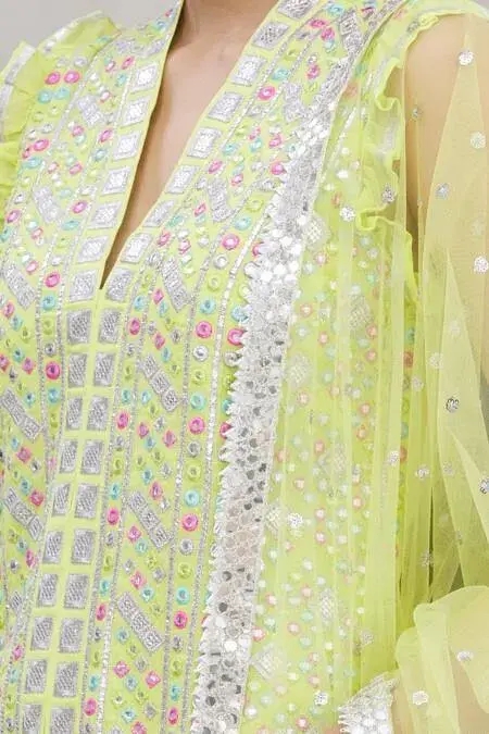 Lime green kurta with all-over intricate mirror embellishments and V-neckline. Comes with sharara and net dupatta.