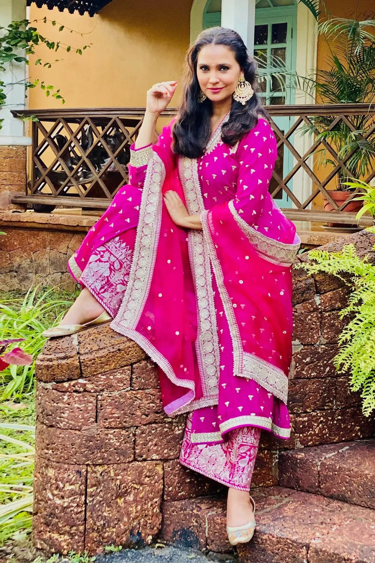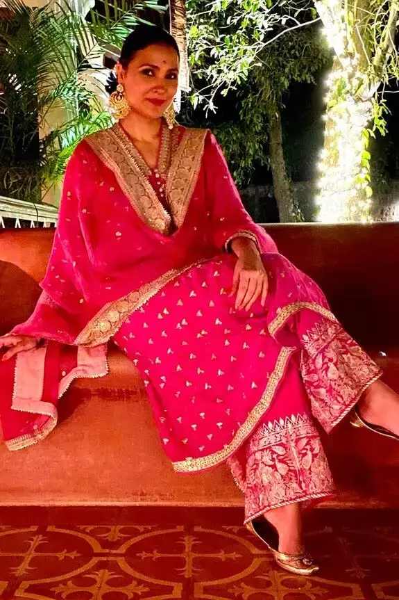 Rani pink jacket-style kurta with all-over lotus motifs and dori-sequin worked neckline.