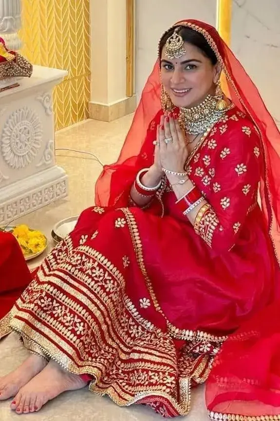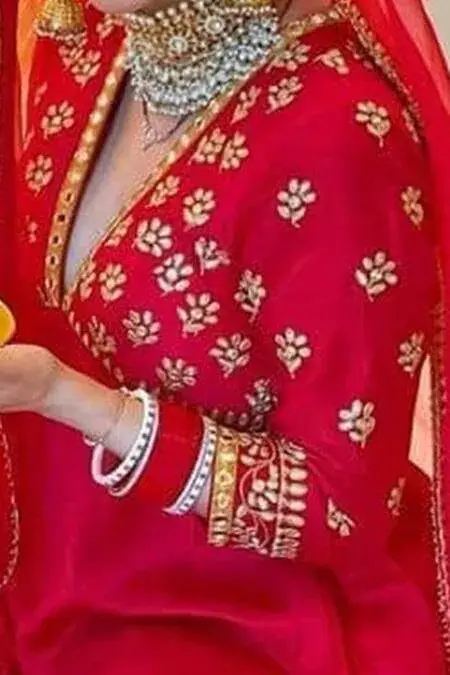 Red kurta with floral embroidered motifs. Paired with embroidered tussar sharara and net dupatta.