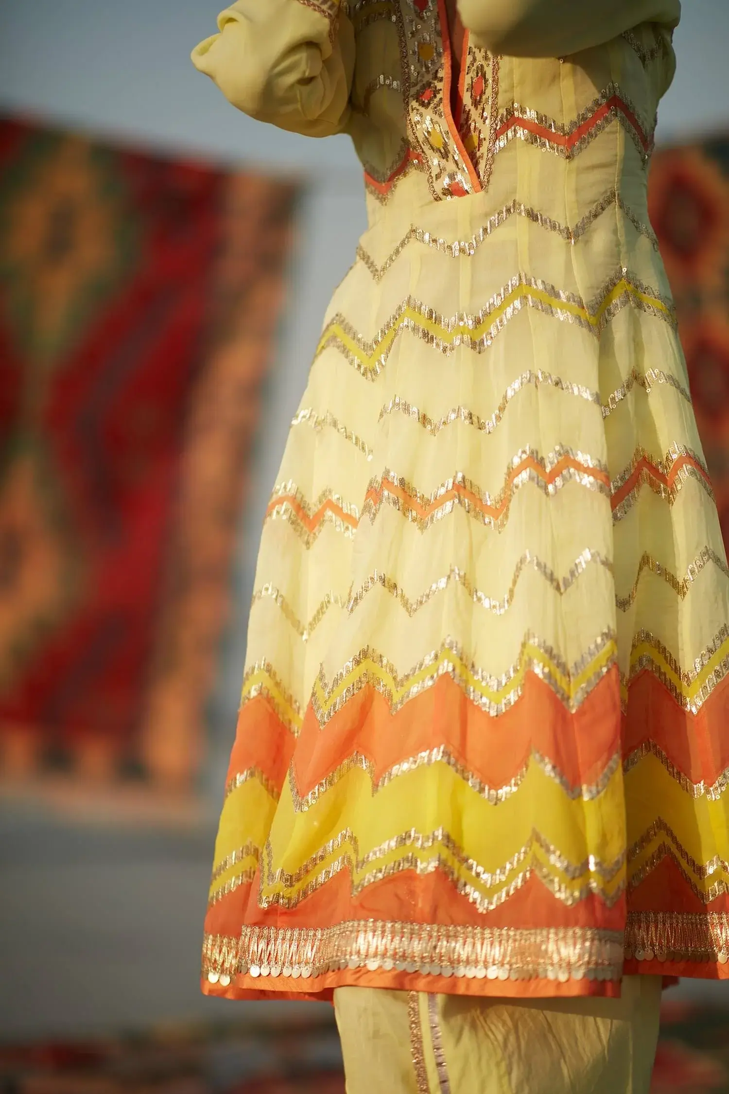 Yellow flared kurta with chevron print and sequin embroidery. Comes with dhoti pants.