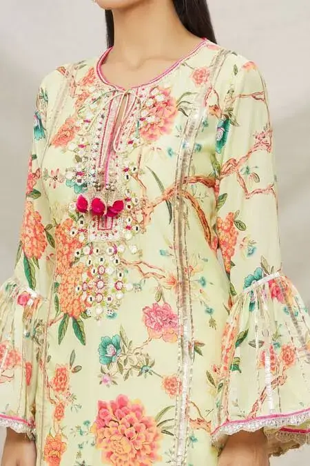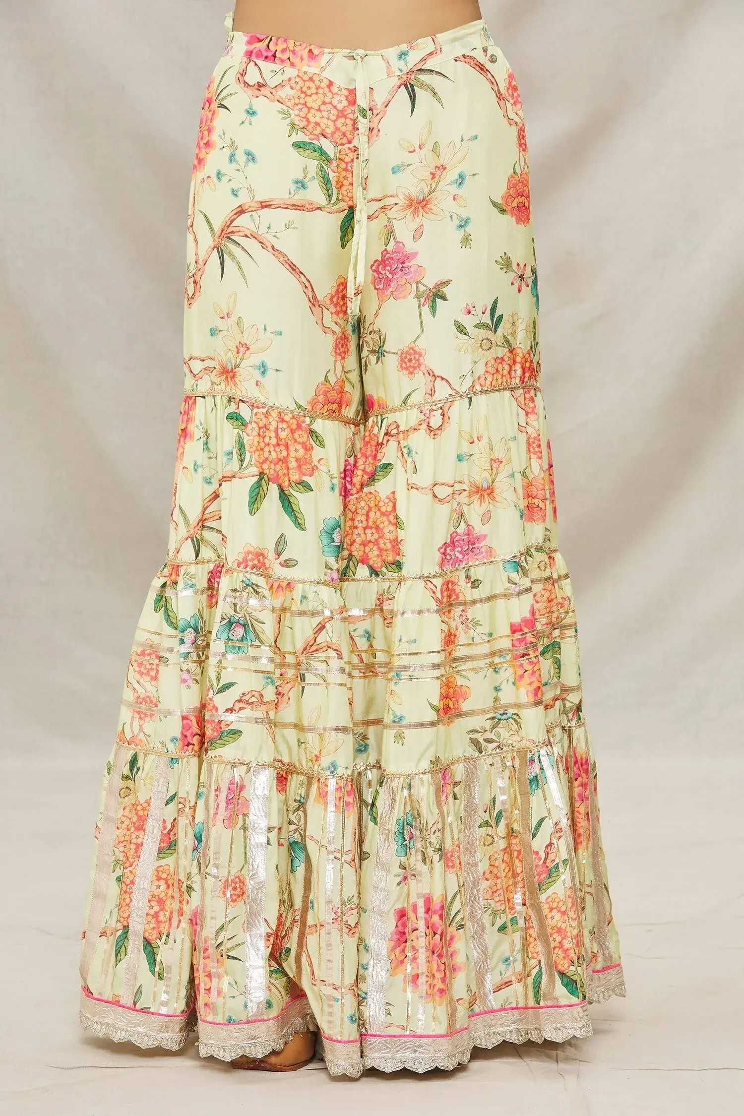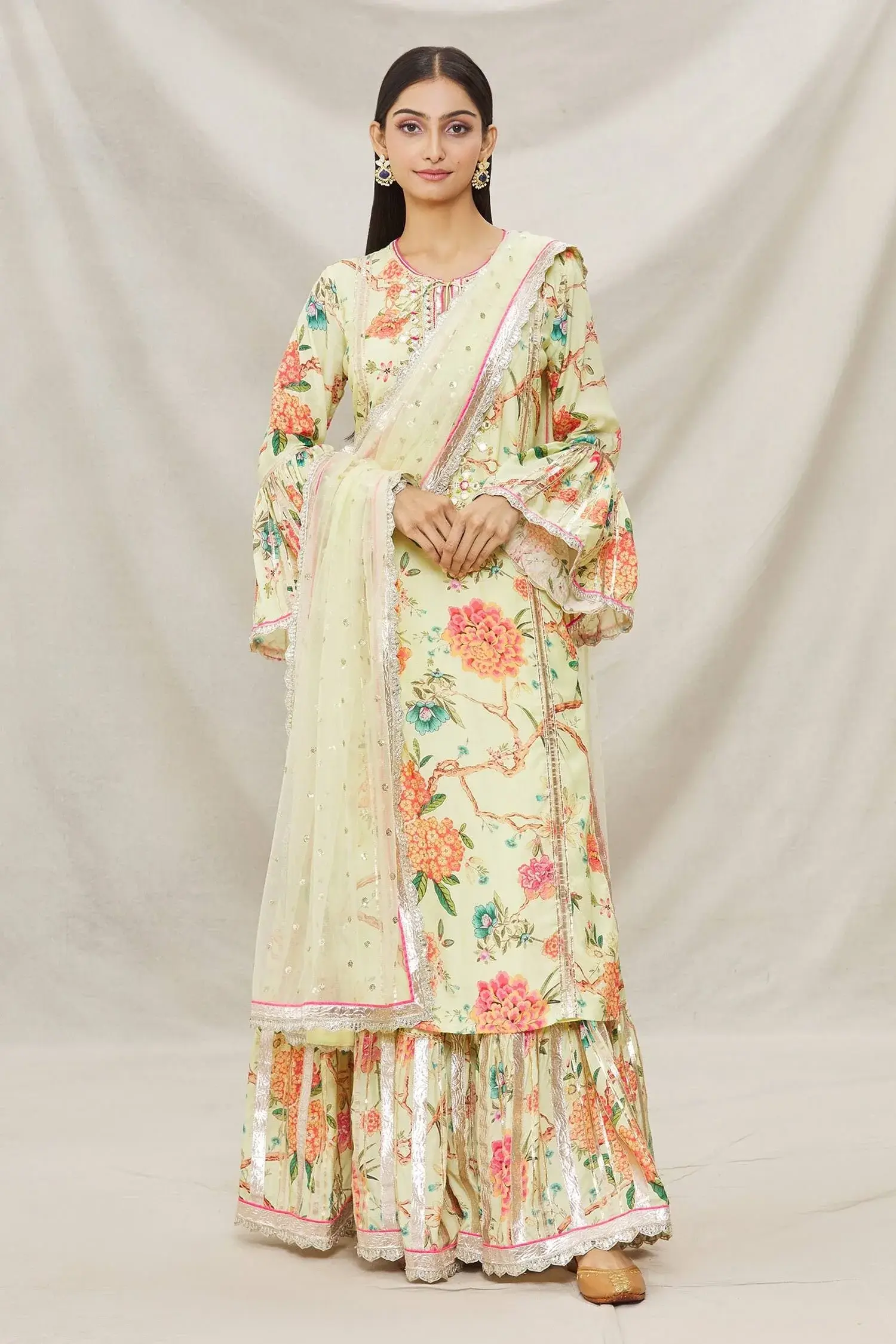 Yellow long kurta with floral prints and embellished yoke. Comes with matching, full ghera sharara and net dupatta.