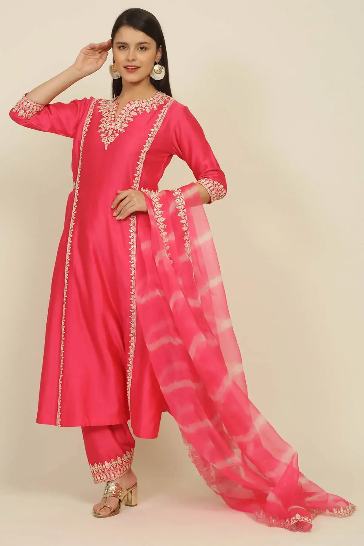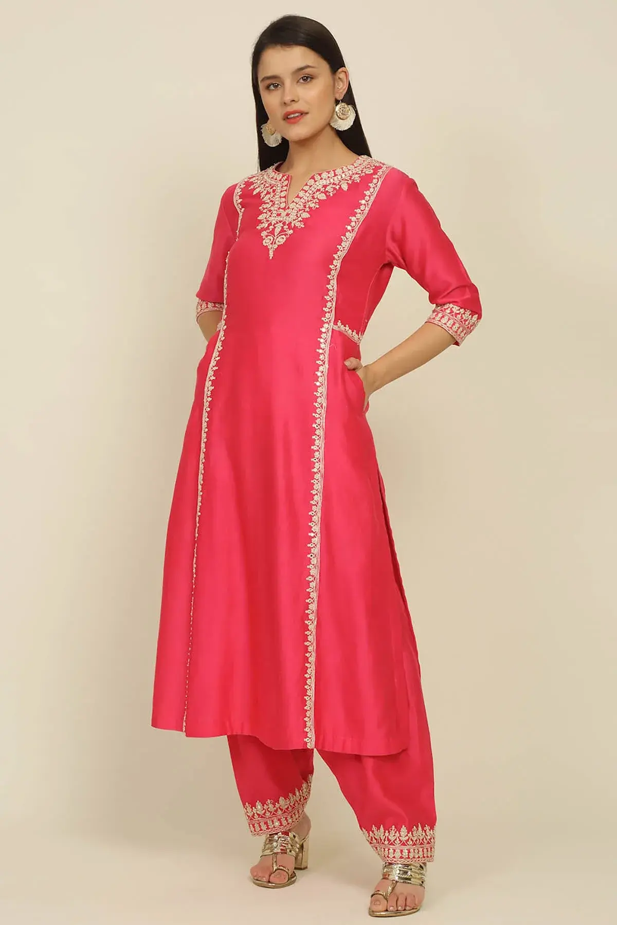 Buy Aastha Jain Fuchsia pink chanderi kurta with dori & mirror embroidery paired with palazzo & dupatta For Women Available online at ScrollnShops