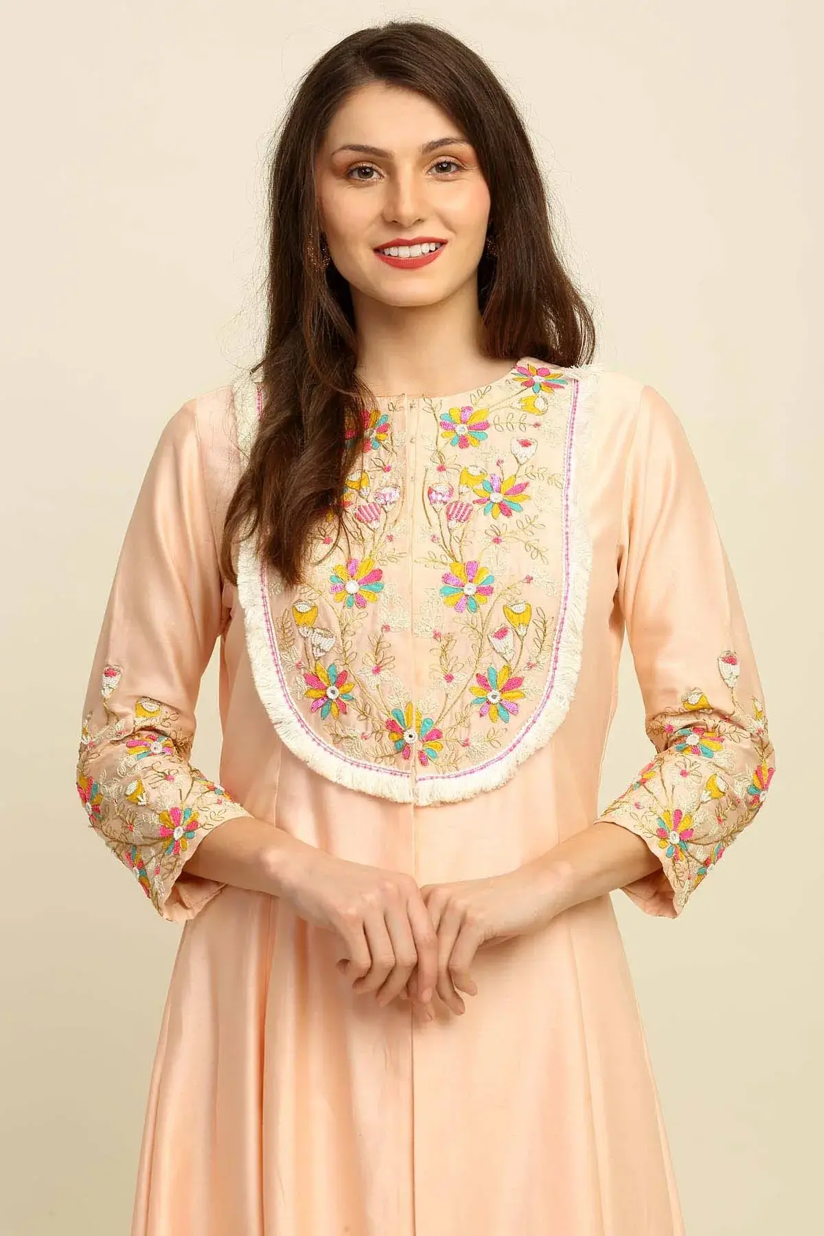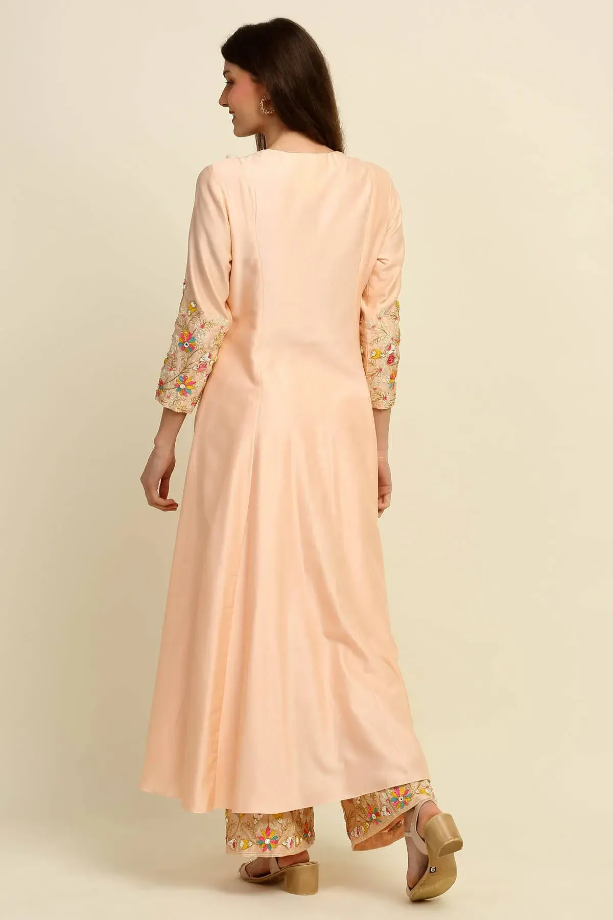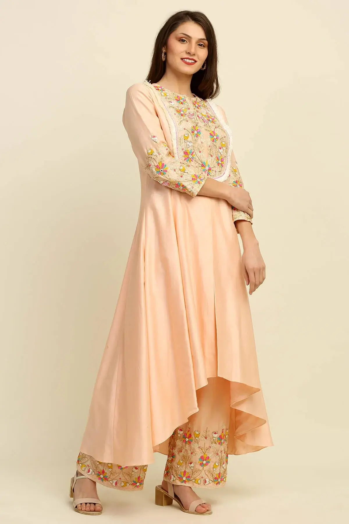 Buy Aastha Jain Peach chanderi kurta with beads embroidery paired with palazzo pants & dupatta For Women Available online at ScrollnShops
