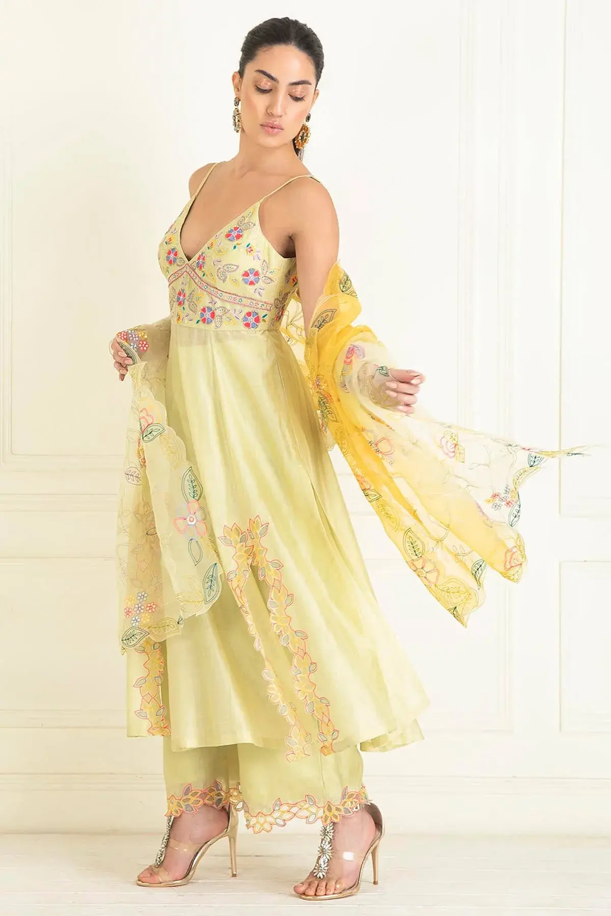 Buy Aastha Jain Iris yellow chanderi anarkali adorned with aari, sequins embroidery paired with pants & dupatta For Women Available online at ScrollnShops
