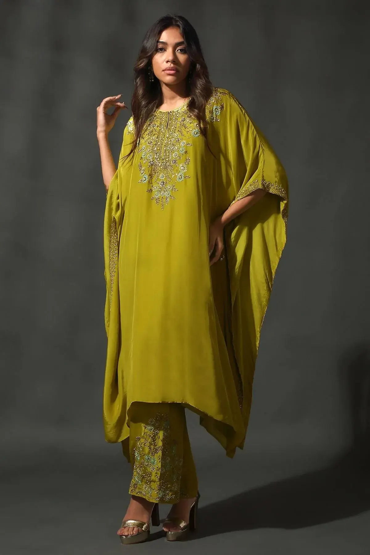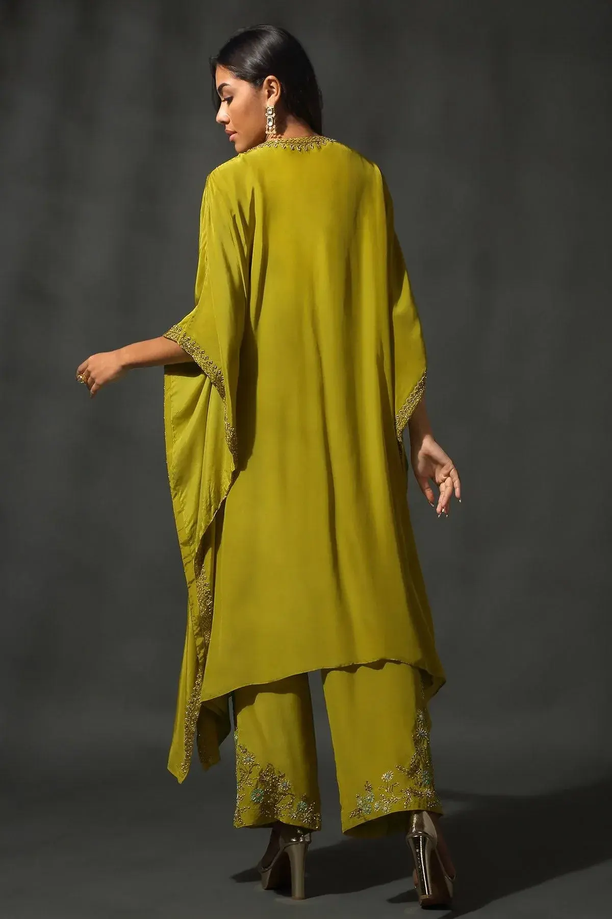 Buy Aastha Jain Bright yellow green sheesha silk round neck kaftan with sequins, beads and cutdana embroidery paired with embroidered palazzo For Women Available online at ScrollnShops