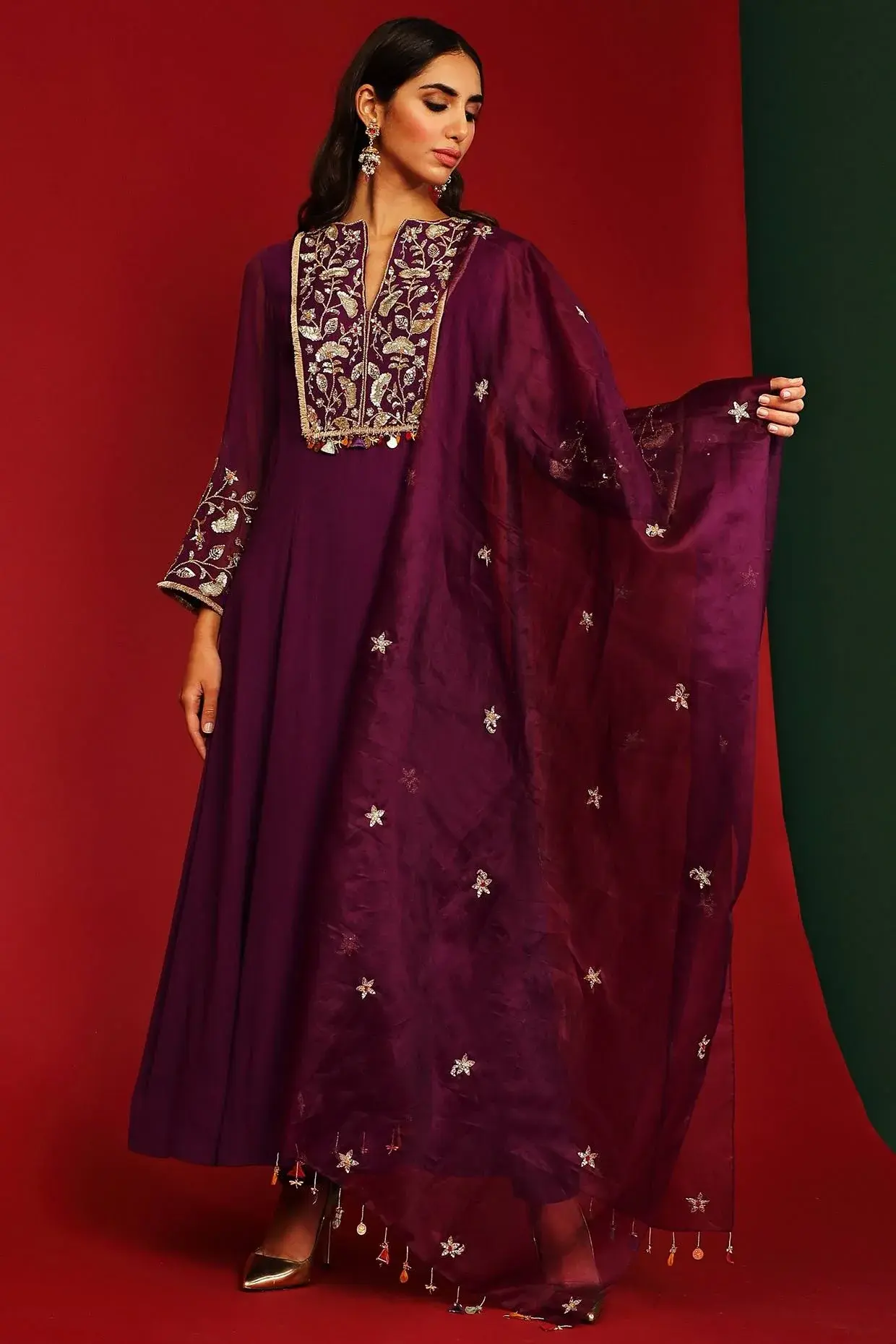 Featuring A Grapevine Kurta In Georgette Base With Embroidery. It Is Paired With Matching Pants And An Embroidered Dupatta Having Hand Made Tassels. Fit: Fitted At Bust And Waist. Composition: Georgette. Care: Dry Clean Only.