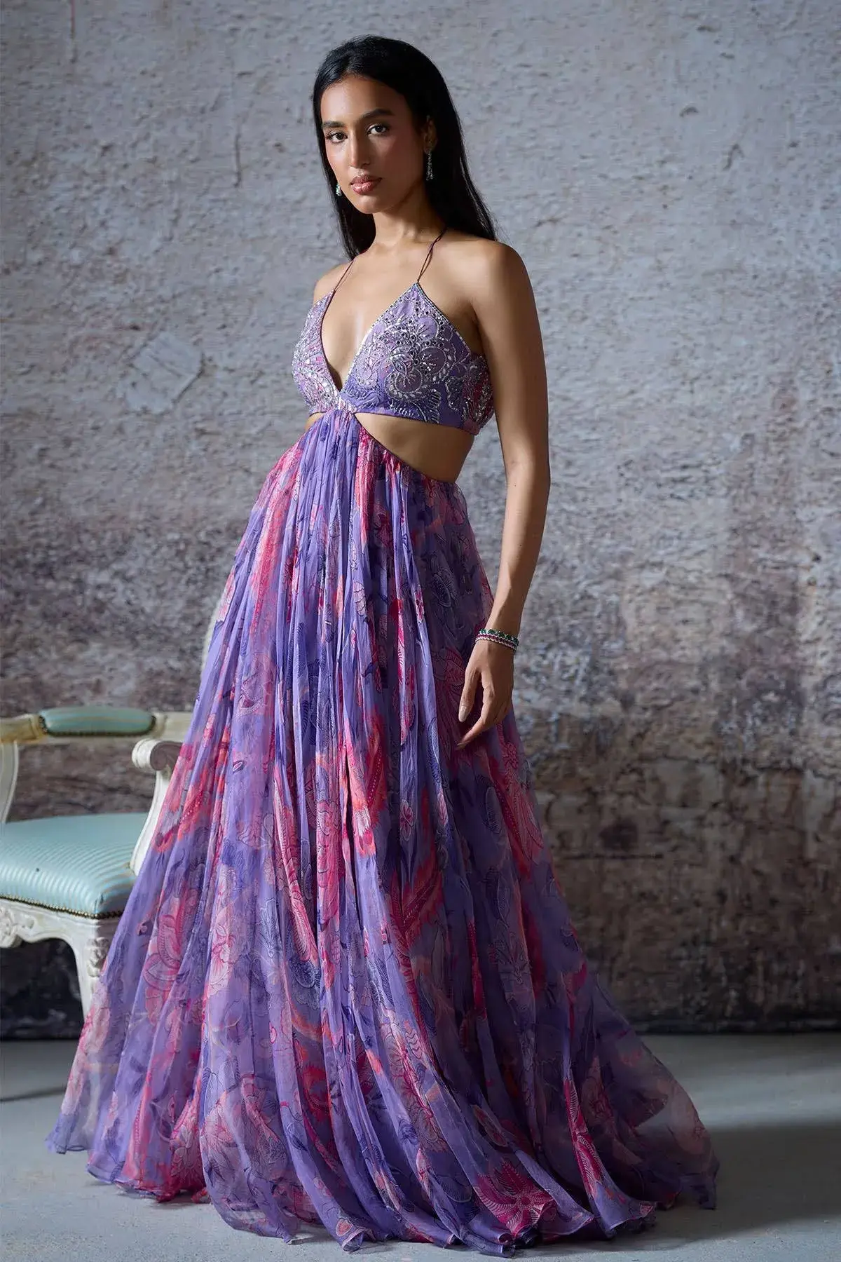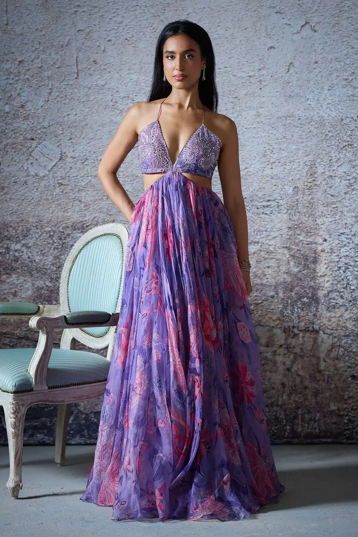 EMBROIDERED GOWN FEATURING CUT OUTS ON THE MIDRIFF AND TIE-UPS FOR A CINCHED FIT . FABRIC: Organza COLOR: Printed Lilac NO.