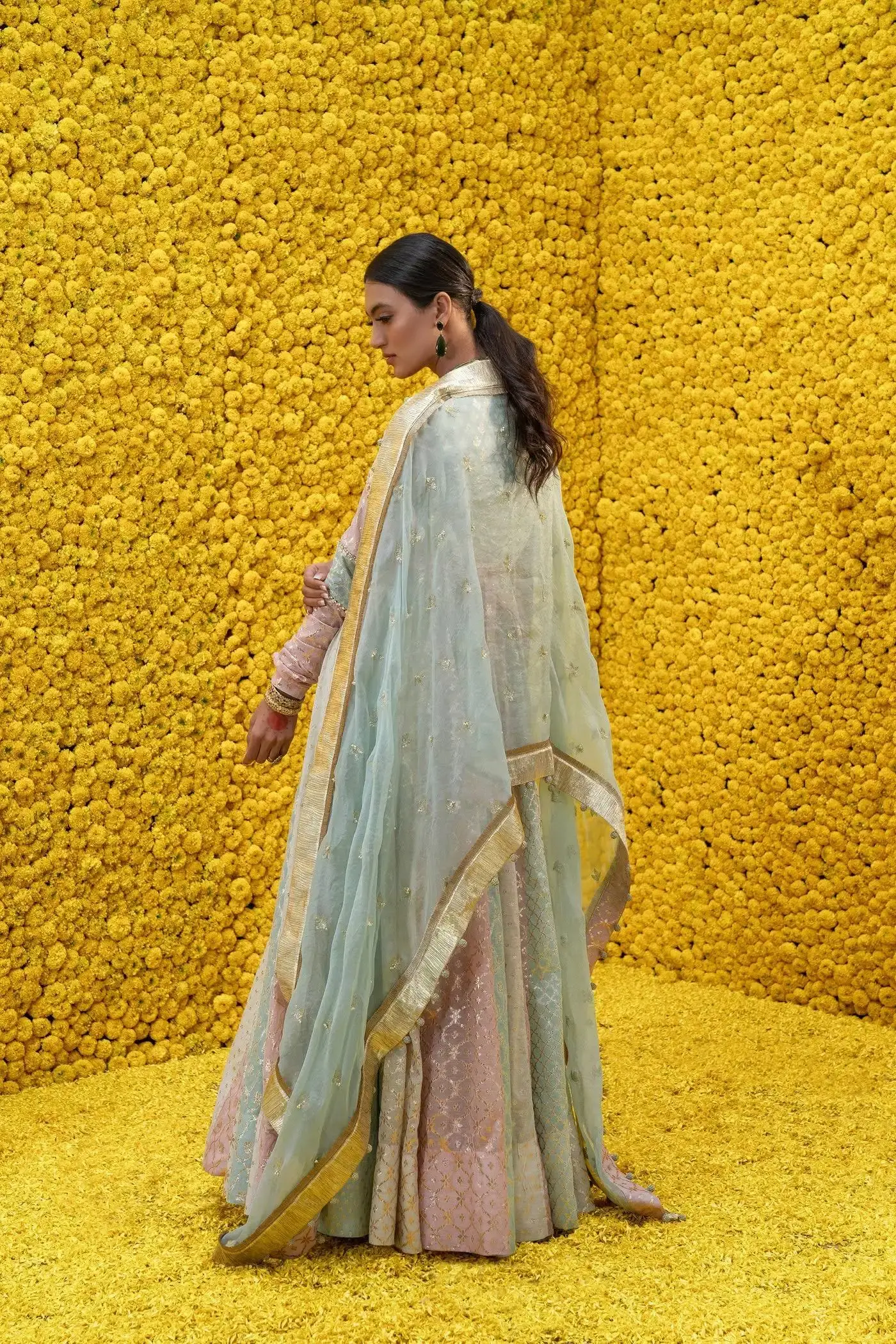 Multicolored banarsi Chanderi embellished anarkali MM logo belt and organza hand embroidered dupatta . Fabric: Banarsi Chanderi,Shantoon,Organza