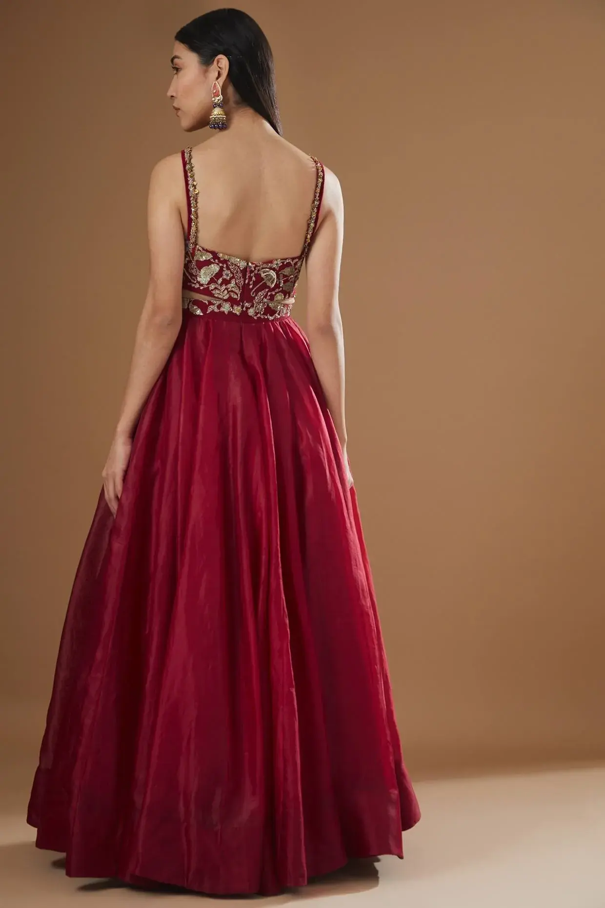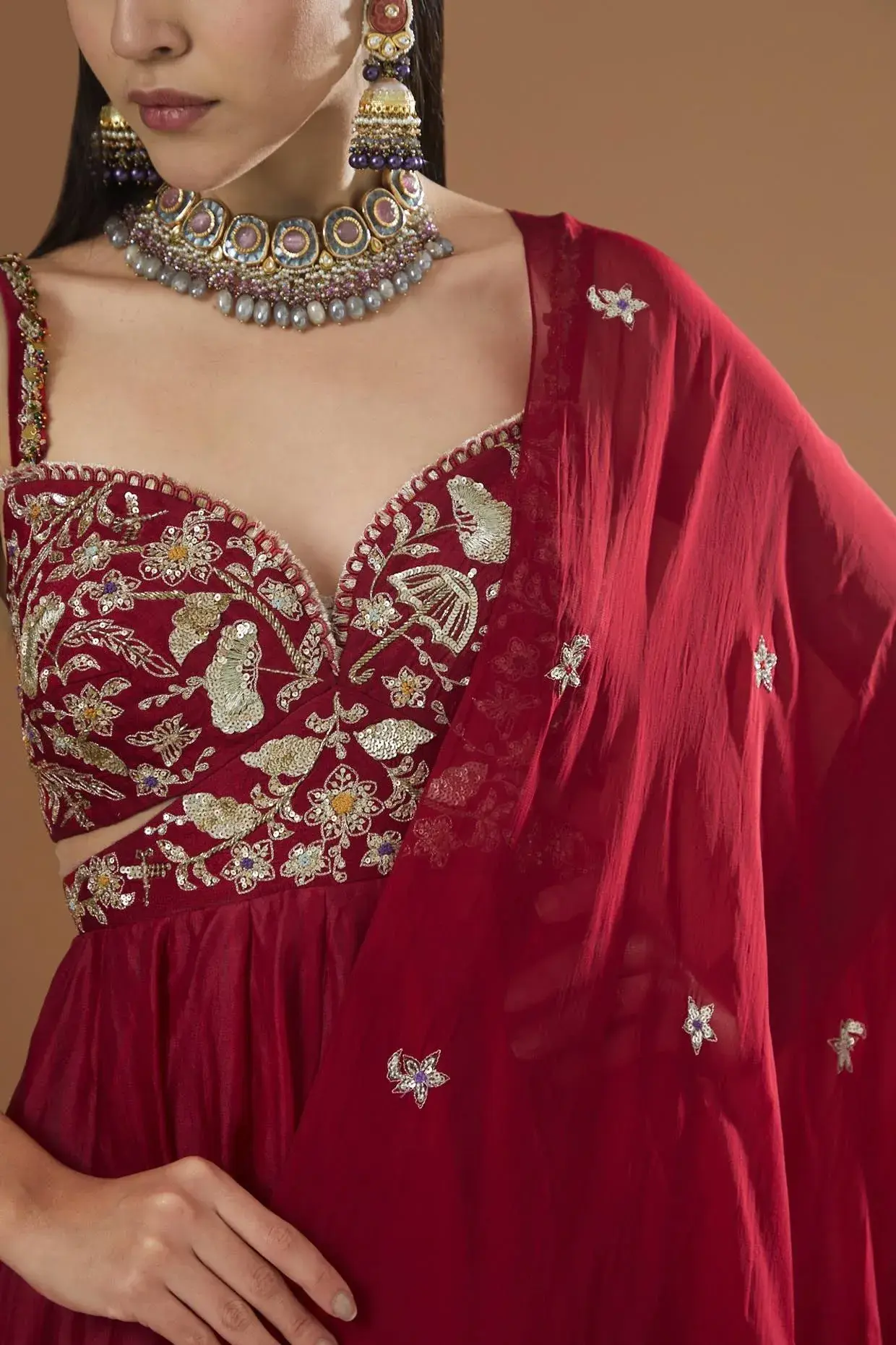 Featuring A Red Anarkali In Organza Base With Embroidery. It Is Paired With A Matching Printed Dupatta Having Tassels. Fit: Fitted At Bust. Composition: Organza. Care: Dry Clean Only.