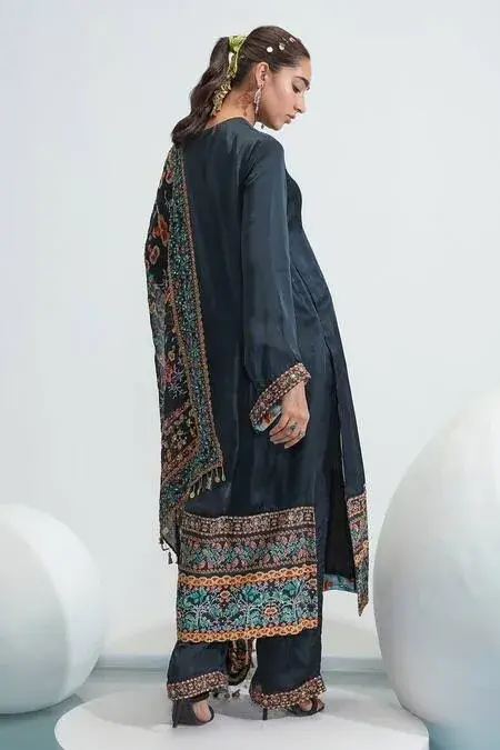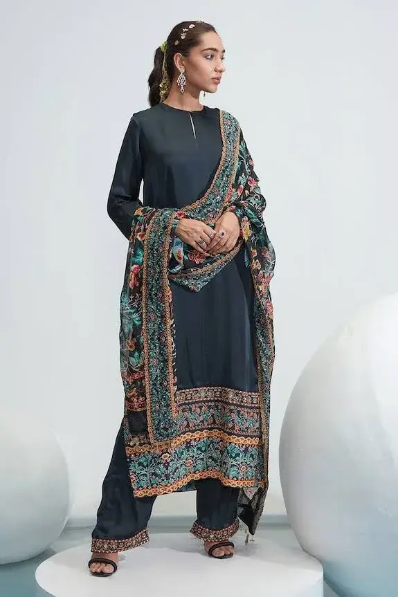 Black satin organza kurta with multi colored floral printed hem with embroidered highlights. Comes with embroidered pant and organza embroidered dupatta. Component: 3 Pattern: Embroidered, Printed Type Of Work: Floral Motifs Neckline: Round Sleeve Type: Full Fabric: Satin Organza, Textured Cotton, Organza, Shantoon Color: Black Other Details: Tassel hem dupatta Front keyhole on kurta Side pocketed kurta Occasion: Sangeet -...