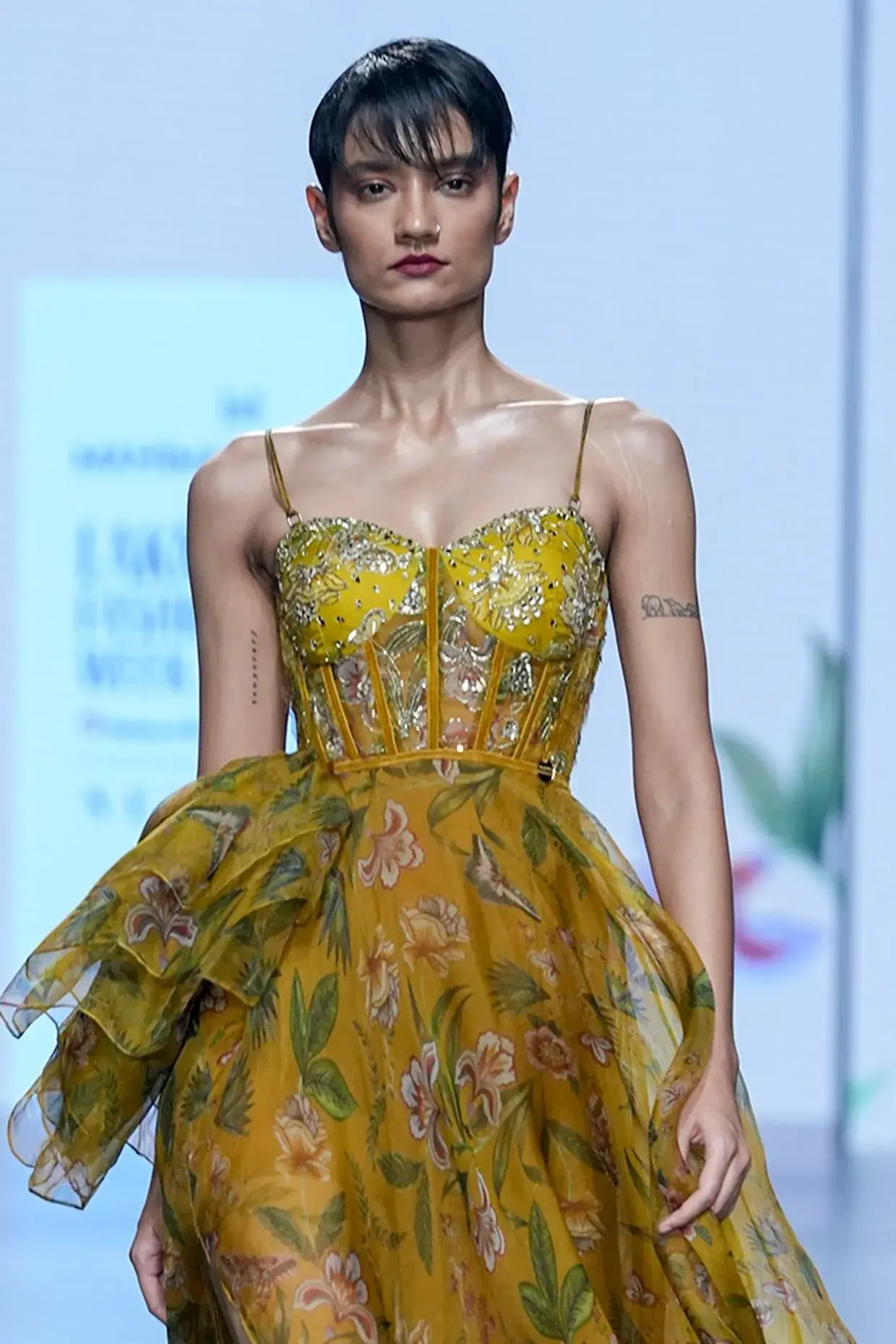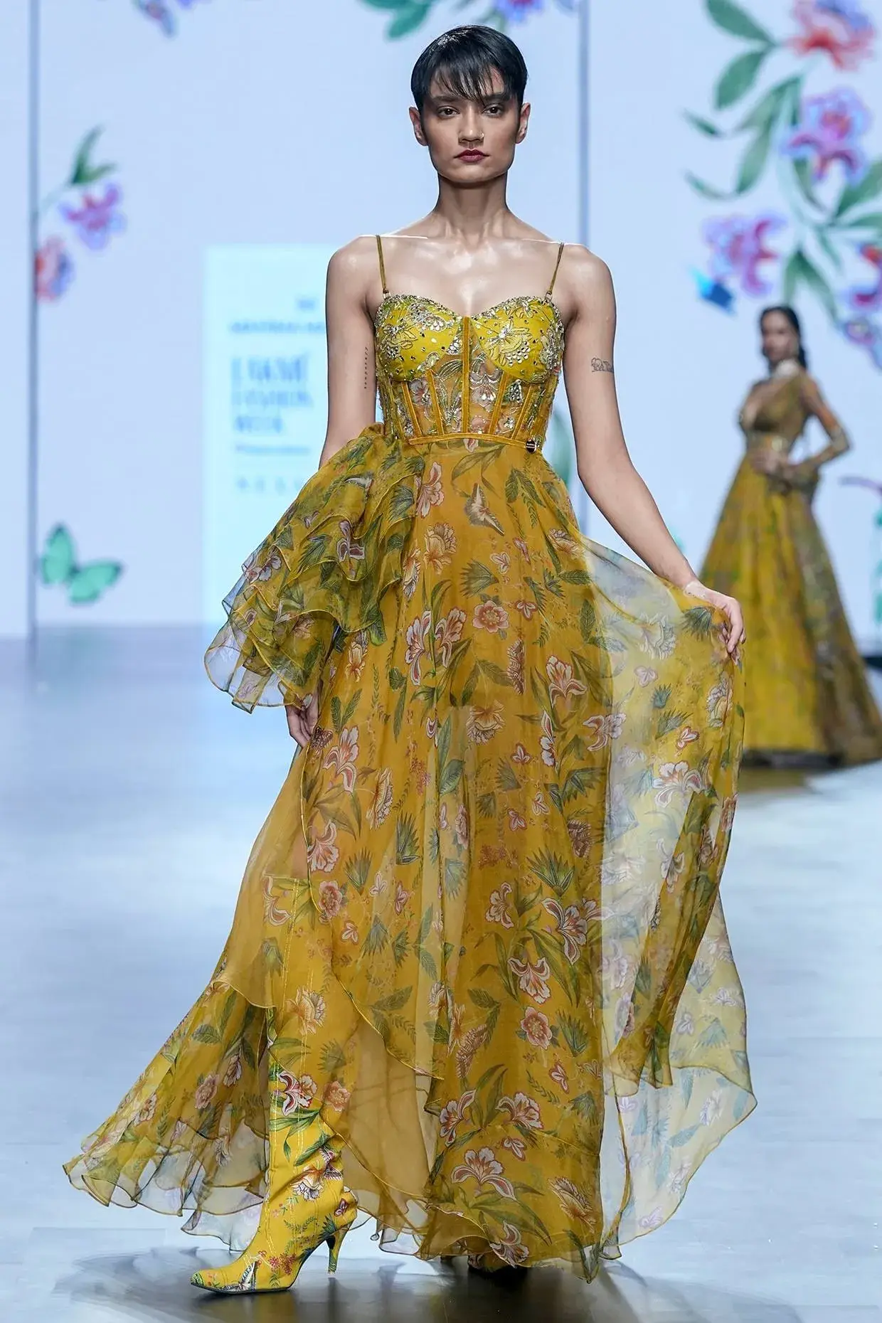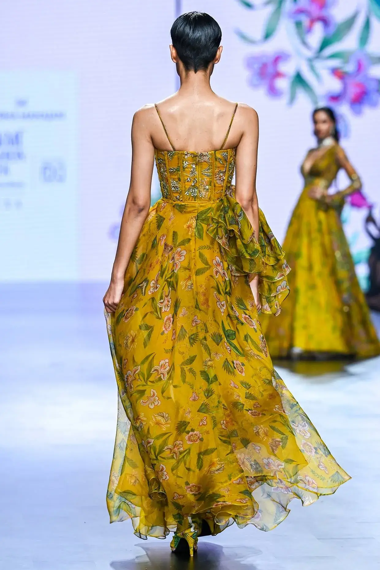 Eesha Mahajan Features A Mesmerizing Yellow Gown That Captivates With Its Elegance. The Eye-Catching Piece Is Crafted In Organza And Soft Net With Embroidery. Accessorize The Designer Gown With Statement Earrings And Heels For Cocktail Parties, Showcasing Style And Sophistication. Components: 1 Fit: Fitted At Bust. Composition: Organza, Soft Net. Care: Dry Clean Only.