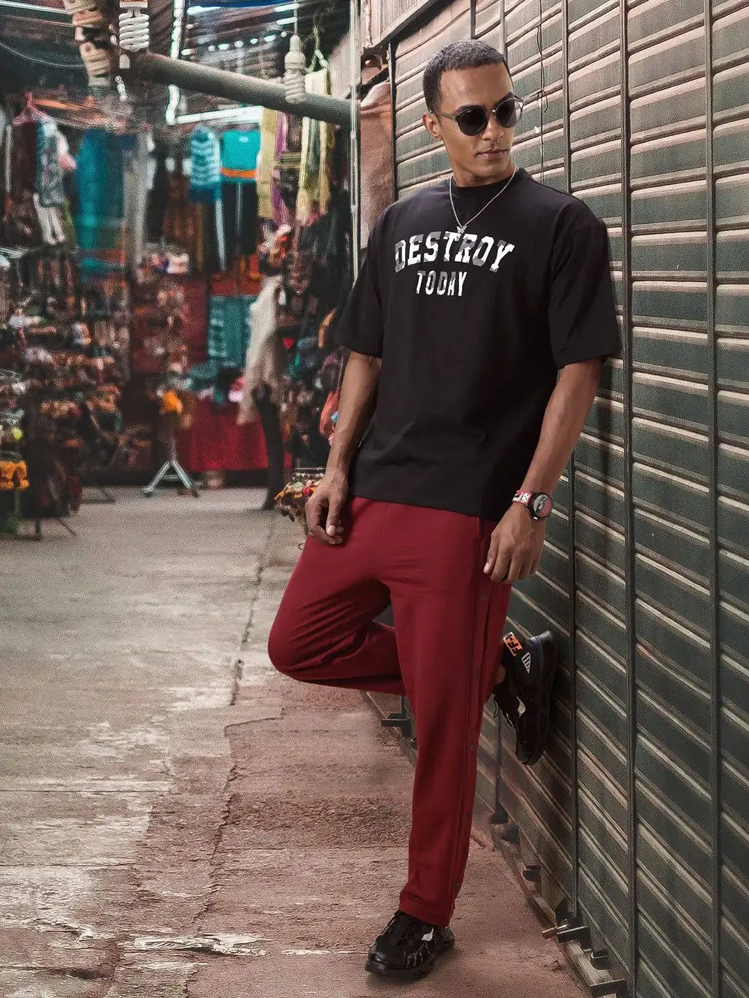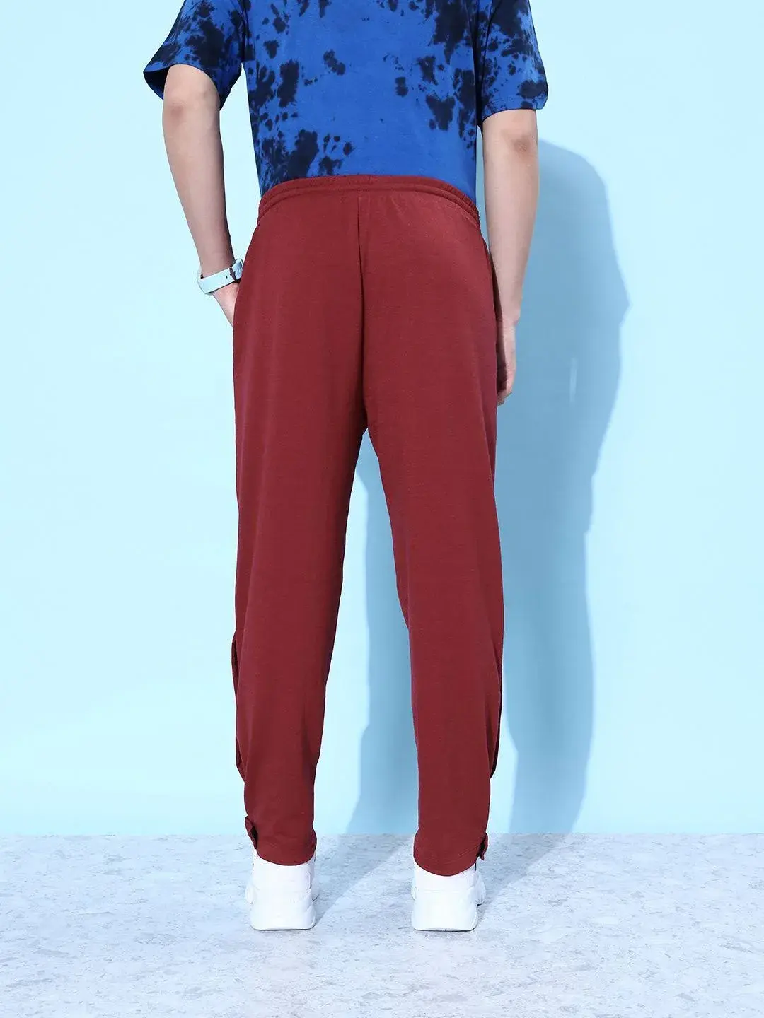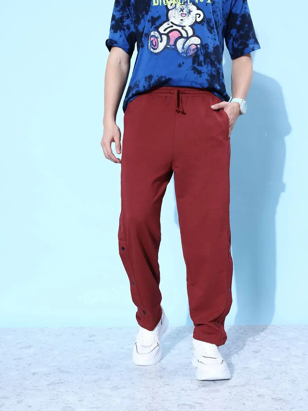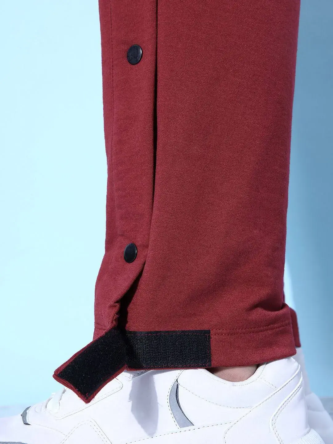 Trend Alert: Work To Lounge: Low efforts and high impression is the motto of this fashion trend! Ditch your stiff & constricted dress code, and opt for something that is both comfy & practical! This trend can be easily achieved by investing in high-quality fabric t-shirts and functional pants Maroon solid mid-rise track pants Snap button taping detail on sides Has an elasticated waistband with a drawstring fastening Two pockets Regular hem with fastening detail Pure cotton Machine-wash