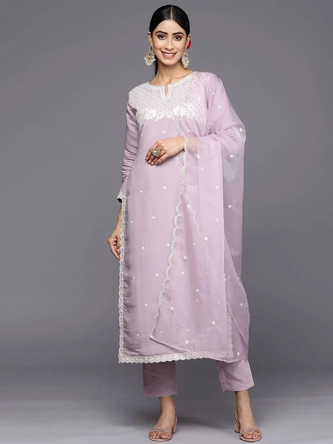 Complemented with solid tone straight pants with an elasticated waistband and roomy pockets, and a matching organza dupatta with scalloped detailing. Adorned with intricate thread-work detailing and delicate sequins accents, this charming style is ideal for light festivities.