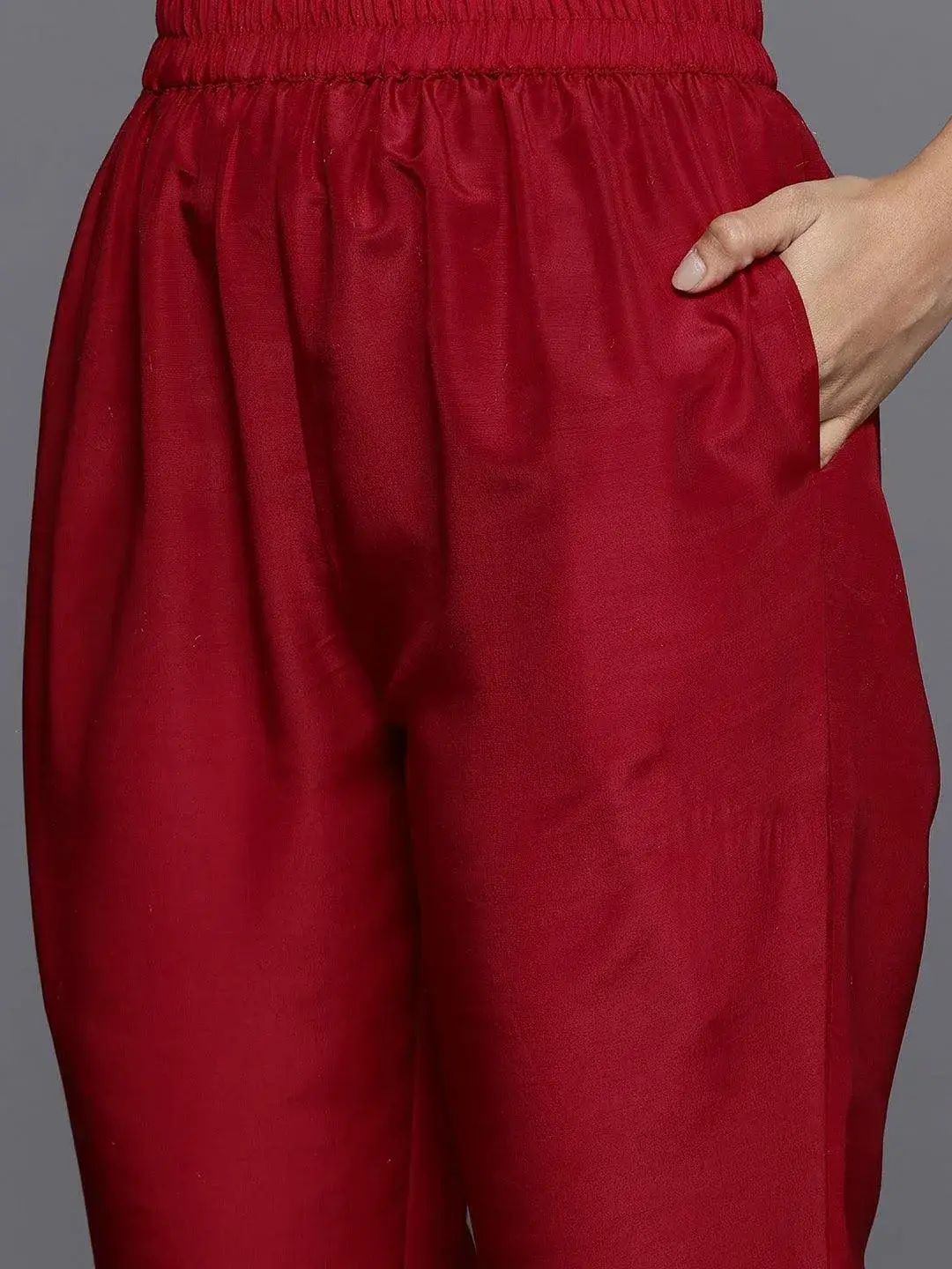 Complemented with solid trousers that have an elasticated waistband, this outfit is best suited for celebrations and festivities.