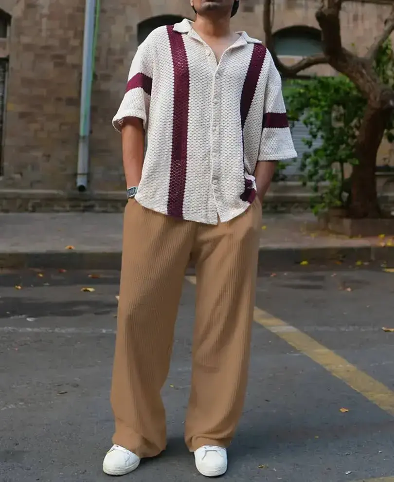 Step into comfort with our beige baggy-fit track pants for men, featuring a customizable drawstring. The sandy color and flattering silhouette fly at both work and leisure. The stretchy fabric moves with you during commutes. Pair with a crisp button-down shirt for important meetings, or dress down with a graphic tee for leisure trips.