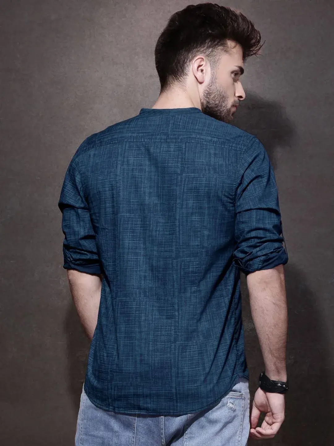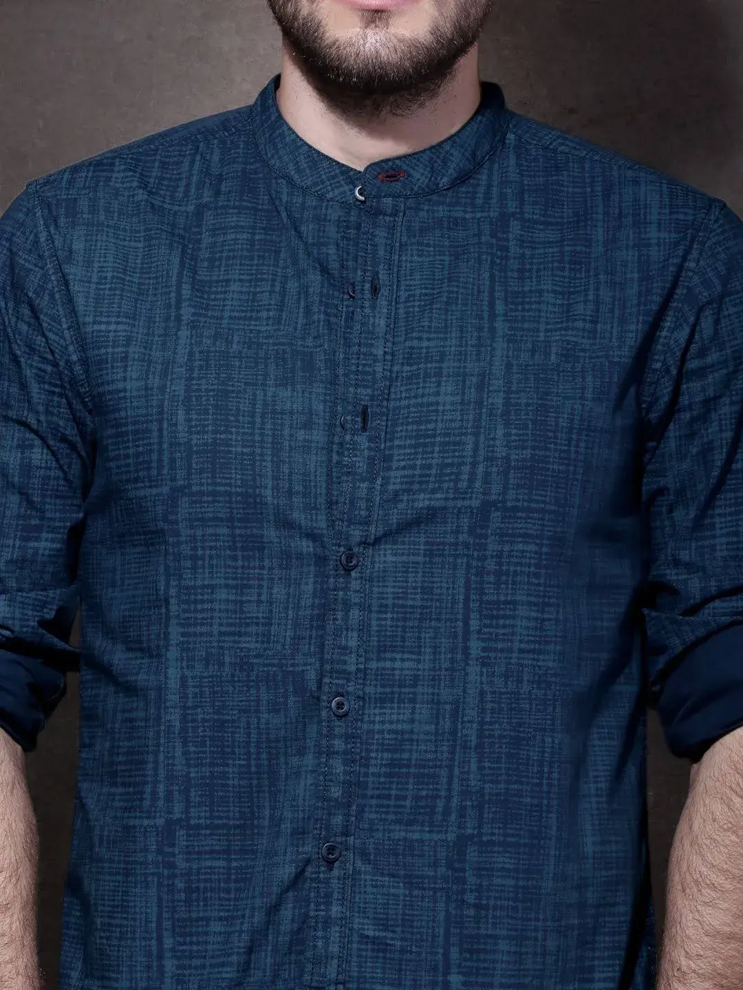 Blue printed casual shirt, has a mandarin collar collar, button placket, long sleeves, curved hem
