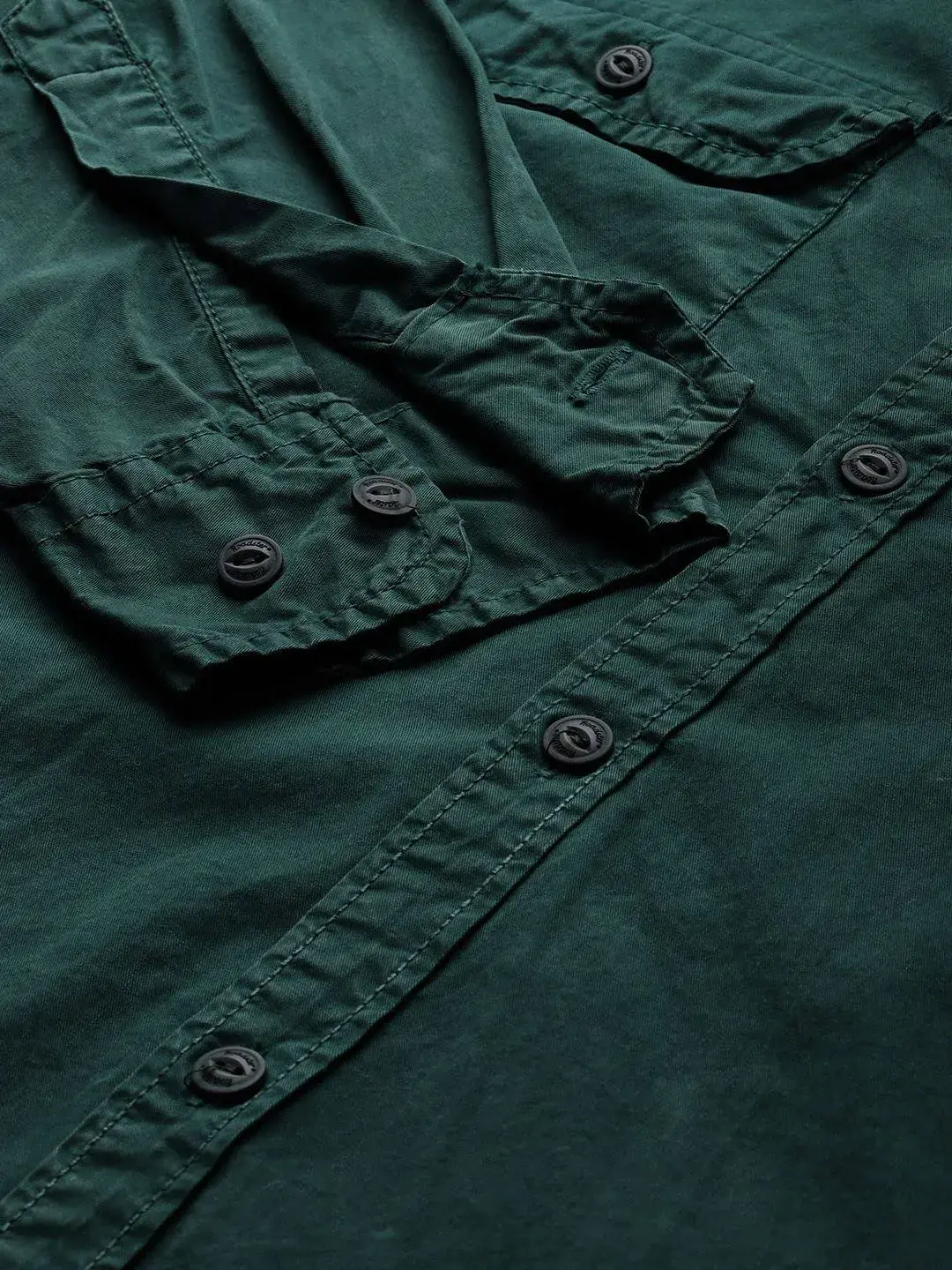 Green solid casual shirt, has a spread collar, long sleeves, button placket, curved hem, and 2 flap pockets