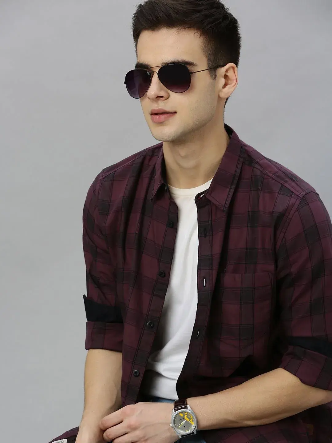 Wine-coloured and Black checked casual shirt, has a spread collar, long sleeves, button placket, curved hem, and 1 patch pocket