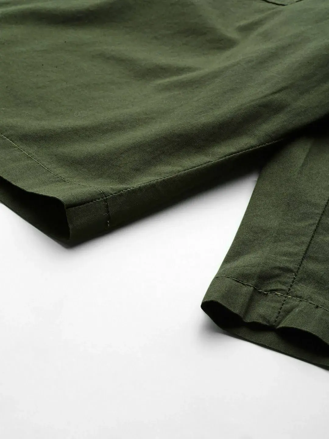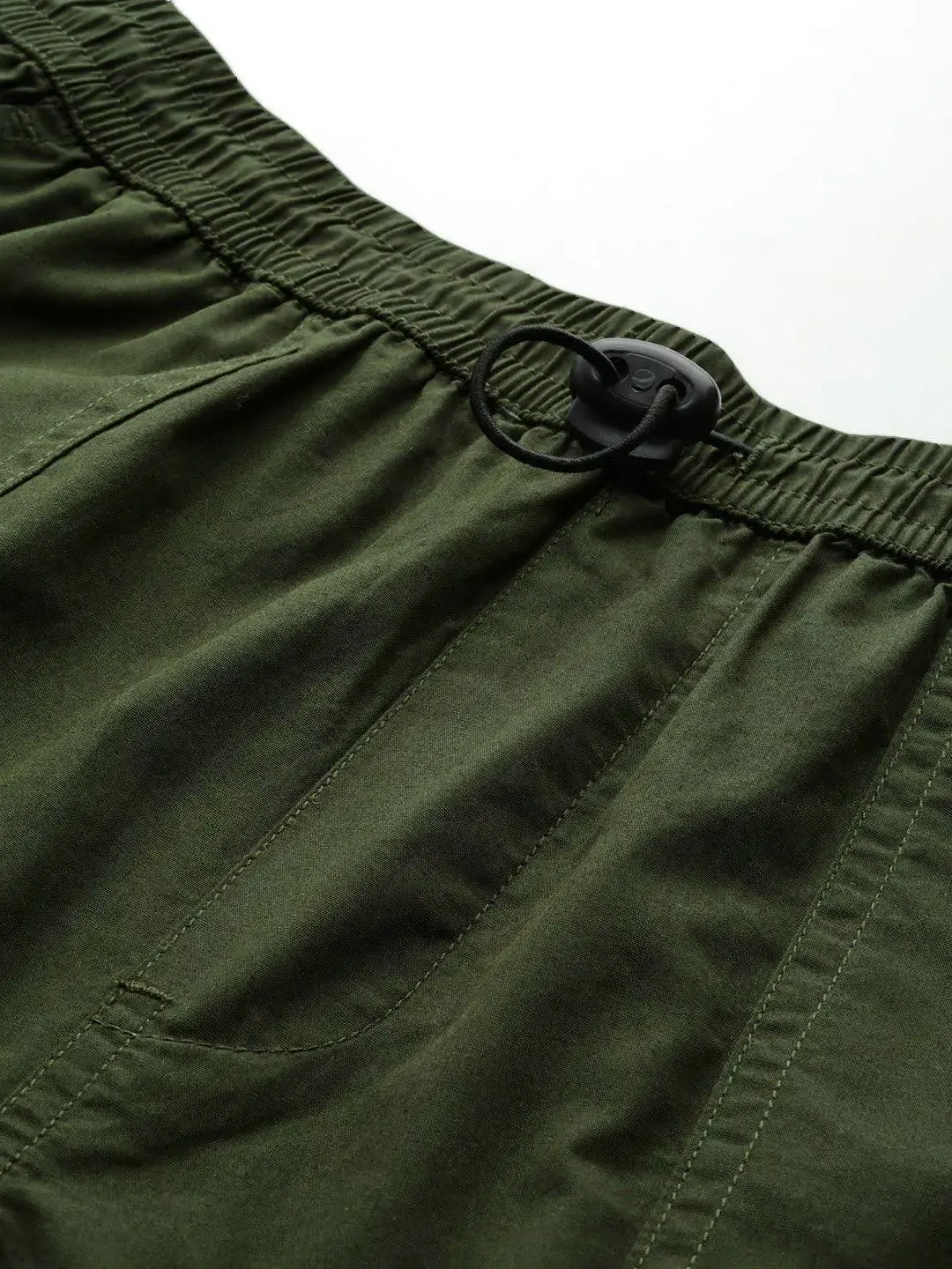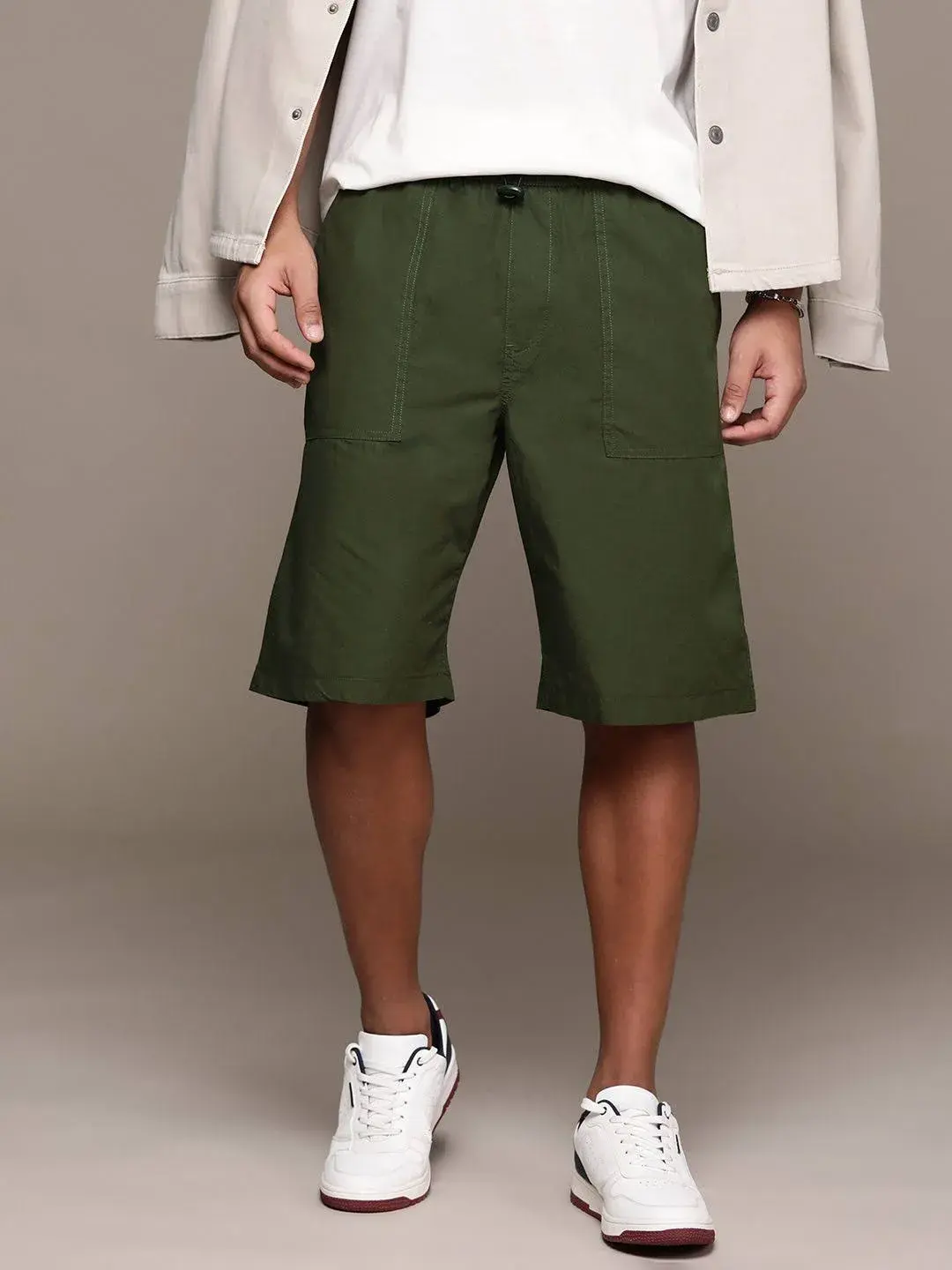 Olive green solid mid-rise regular shorts, has 3 pockets, drawstring closure