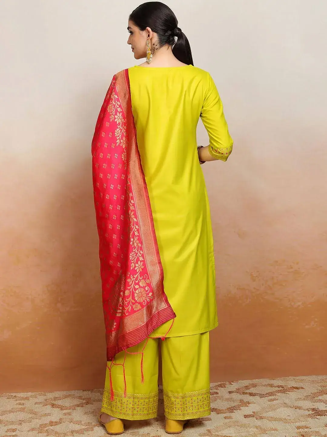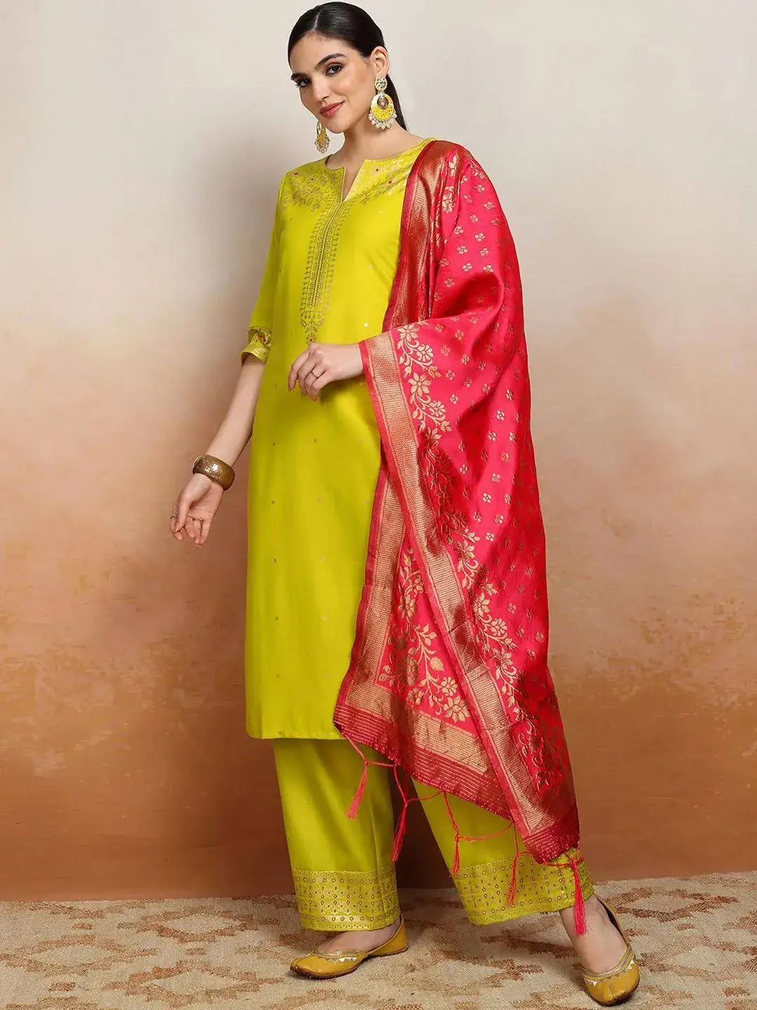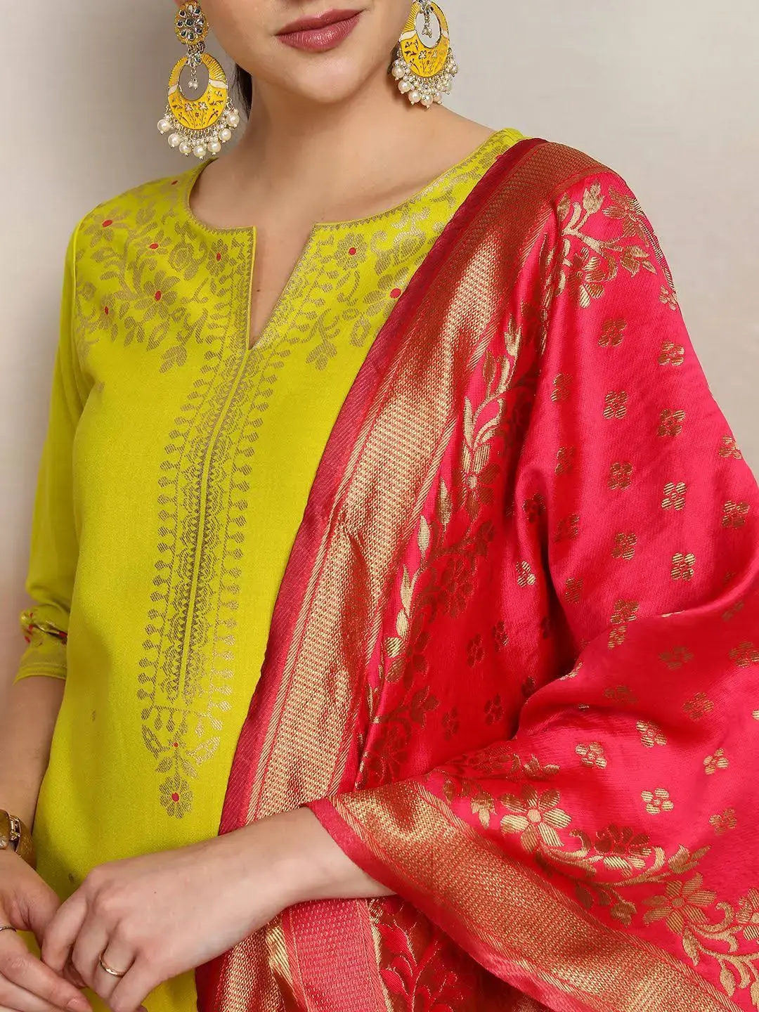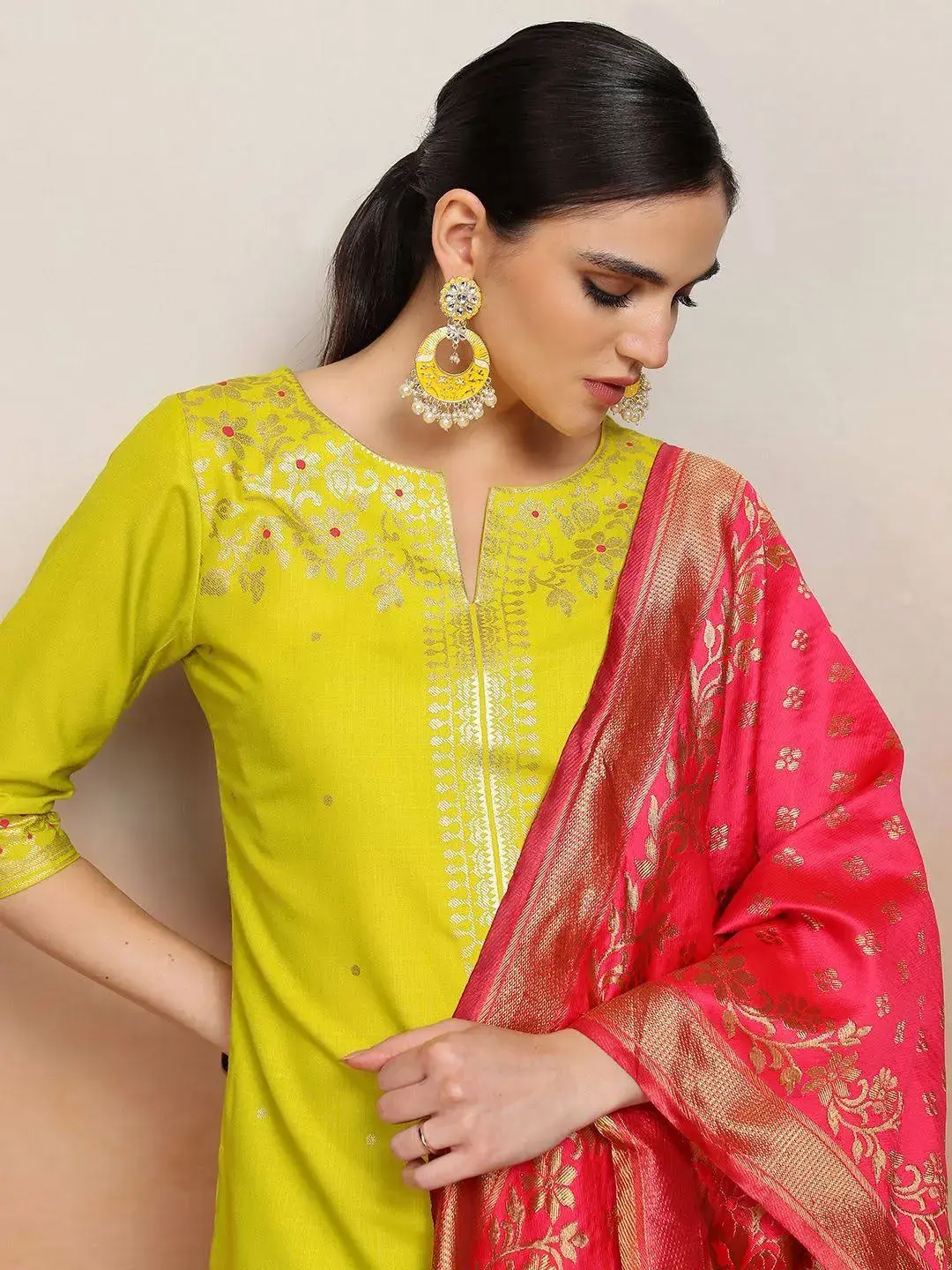 Lime green printed Kurta with Palazzos with dupatta Kurta design: Ethnic motifs printed Straight shape Regular style Round neck, three-quarter regular sleeves Calf length with straight hem Polyester machine weave fabric Palazzos design: Printed Palazzos Elasticated waistband Slip-on closure