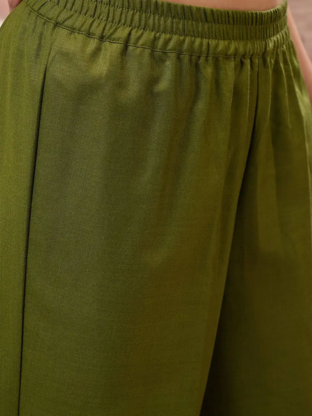 Olive green embroidered Kurta with Palazzo & dupatta Kurta design: Ethnic motifs embroidered Straight shape Regular style Round neck, three-quarter regular sleeves mirror work detail Calf length with straight hem Polyester machine weave fabric Palazzo design: Solid Palazzo Elasticated waistband Slip-on closure Dupatta design: Self design dupatta Tassels border