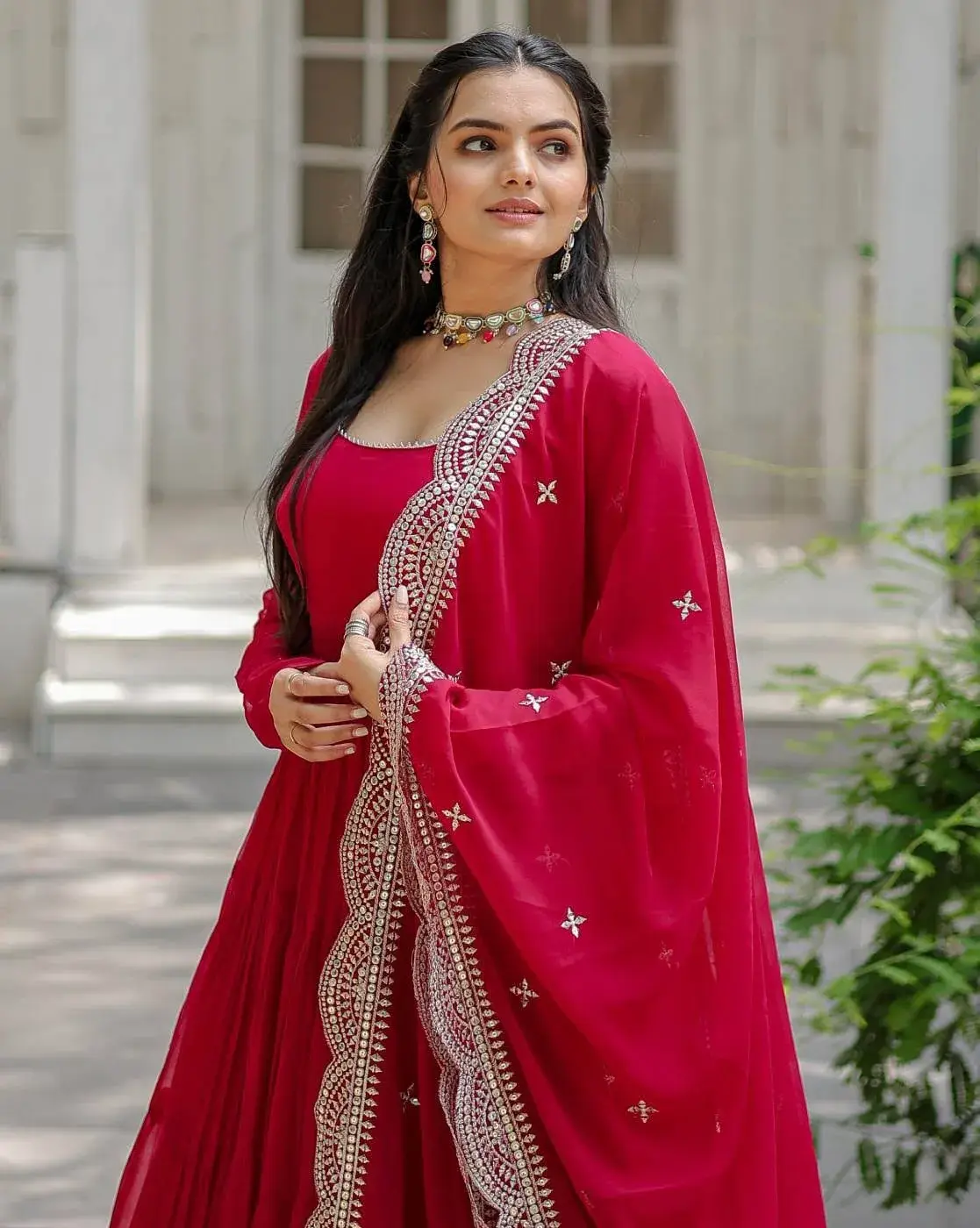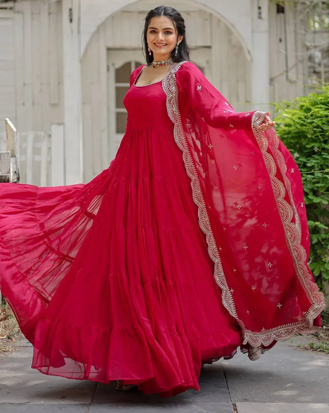 Pink, Women Embroidered Flared Kurta Suit Set Kurta Suit Sets perfect for Casual occasion. Suggested care is to Dry clean.