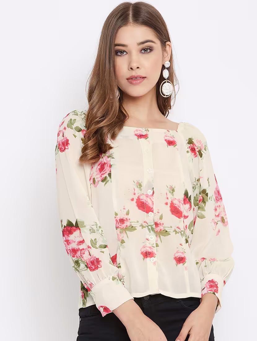women's beige regular fit floral printed square neck top